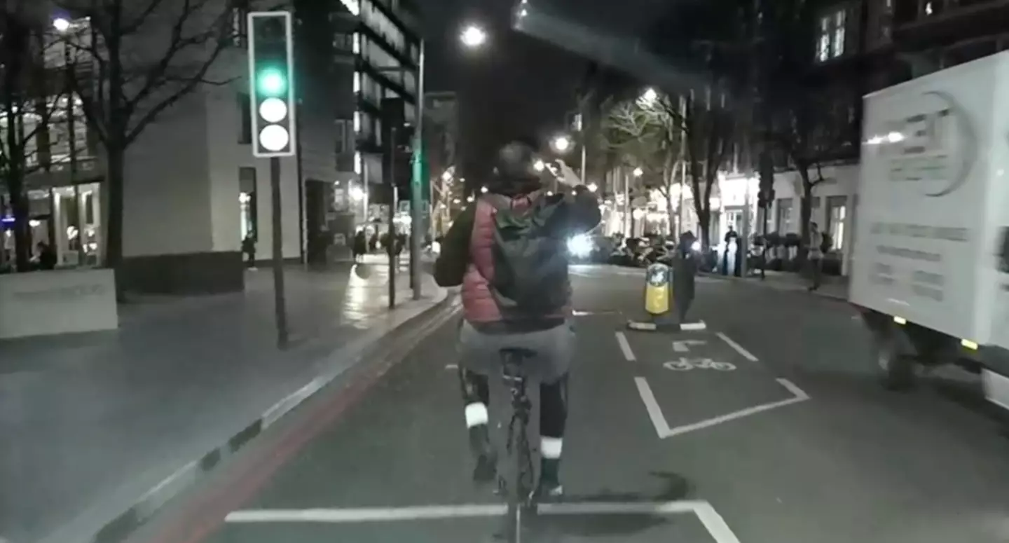 A cyclist has been slammed for using his phone and riding dangerously in central London, with some accusing him of mocking the Highway Code changes. Here is the footage: