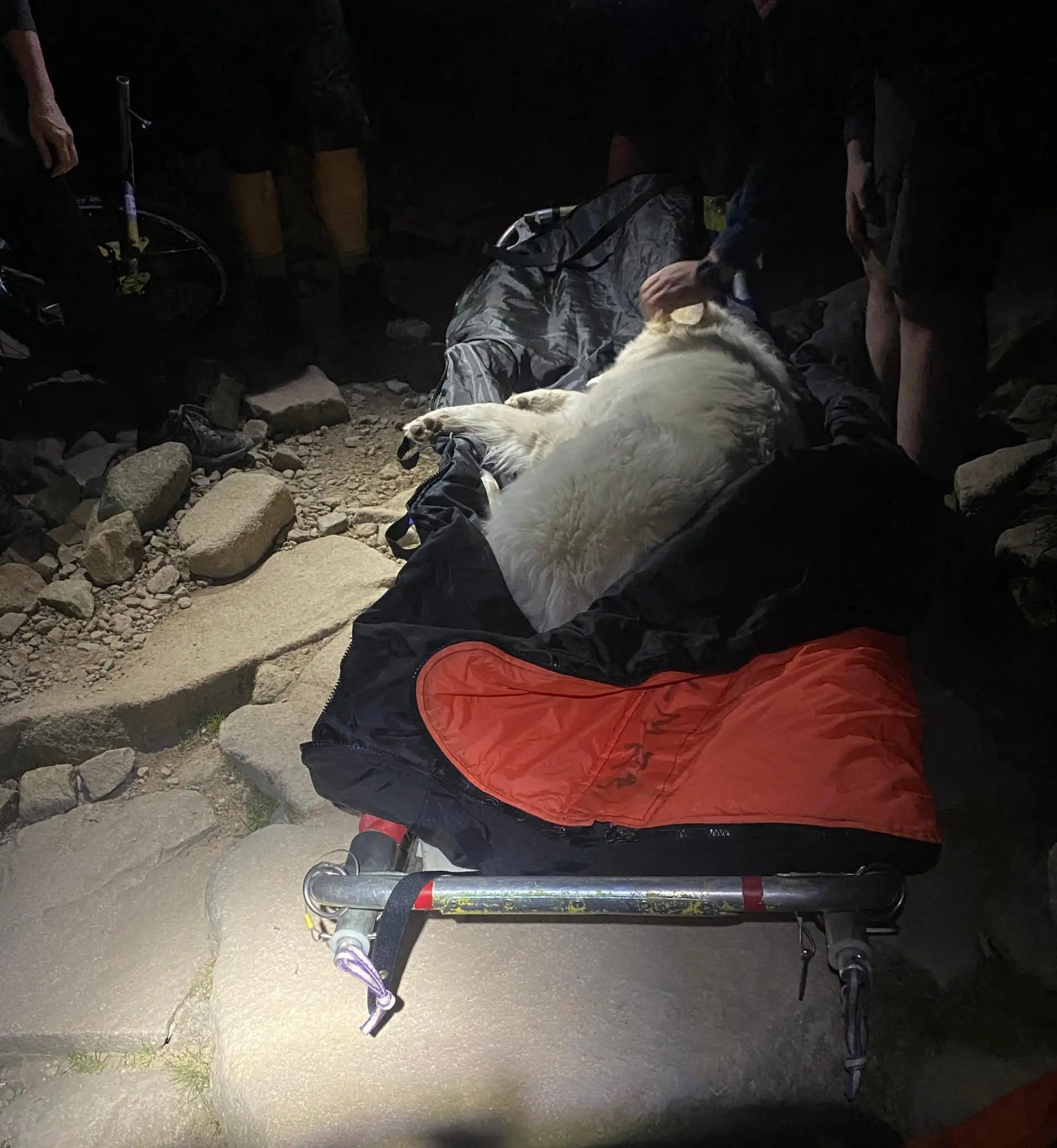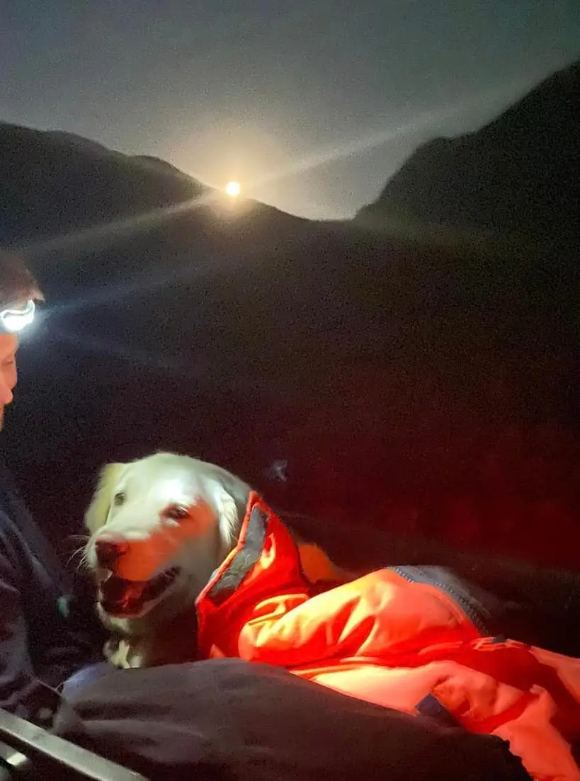 Maggie, a golden Turkish Akbash dog, who weighs 35kg, was stretchered down Ben Nevis by the Lochaber Mountain Rescue Team.