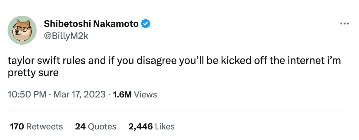 It all started when the Tesla CEO responded to another Twitter user's post about the singer, in which they wrote: "Taylor Swift rules and if you disagree you’ll be kicked off the internet I'm pretty sure."