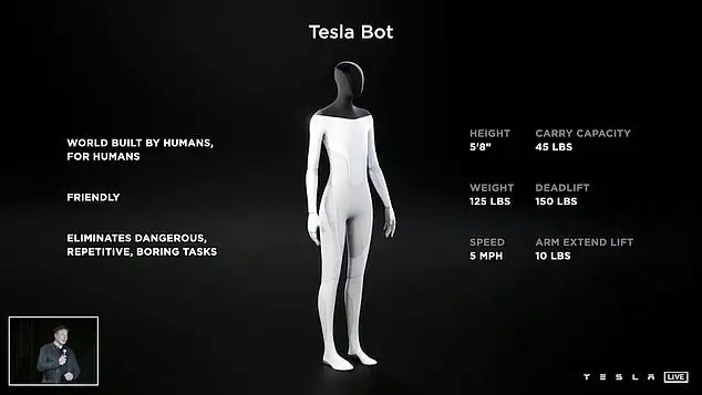 Musk says the humanoid robot will be capable of dead-lifting 150 pounds (69kg), while being able to carry 45 pounds (21kg).