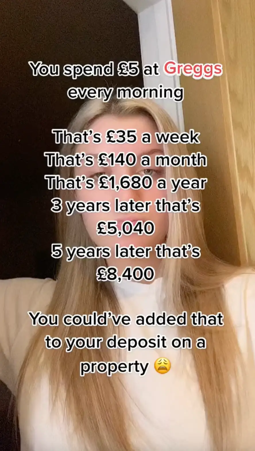 Posting on TikTok, Midlands-based DM & Co. Homes shared a clip which explained: “You spend £5 at Greggs every morning. That’s £35 a week. That’s £140 a month. That’s £1,680 a year. Three years later, that’s £5,040. Five years later, that’s £8,400. You could’ve added that to your deposit on a property.”