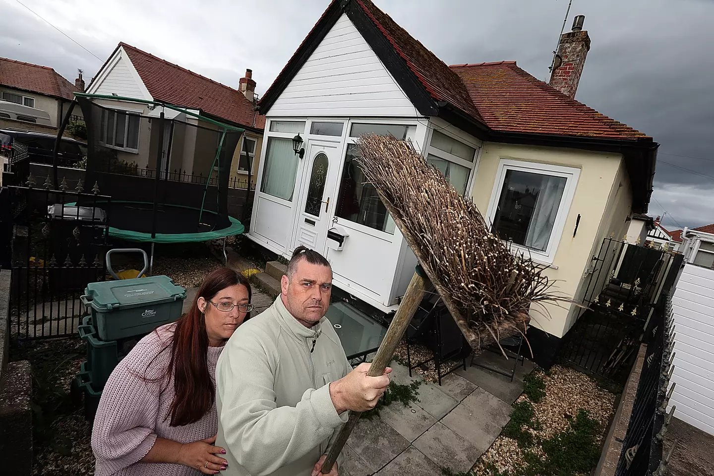 Dave Baker, 43, and wife Nicki, 41, say they have to arm themselves with brooms or walking sticks if they want to leave their home and have to pop up a parasol if they want to take their pooch on a short walk around the garden.
