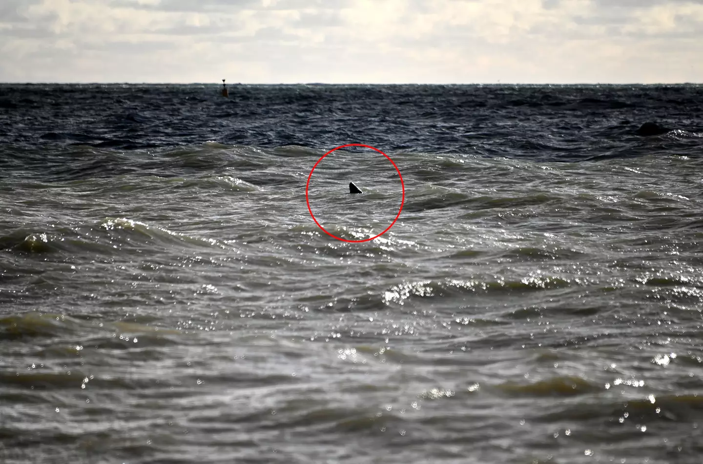 James Venn, 42, spotted a triangular fin jutting out of the water while he was standing on the beach at Goring-by-Sea near Worthing, West Sussex – initially just thinking it was a seal.