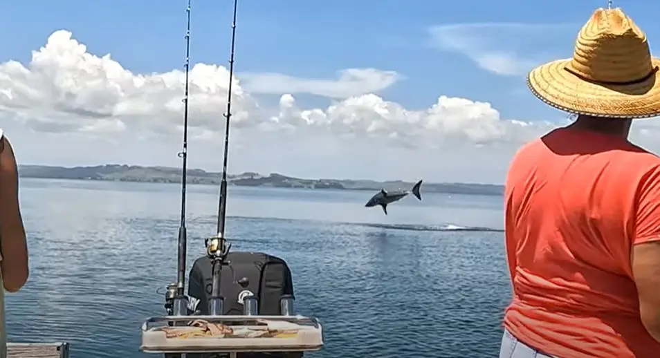 In the clip, you can see the shark leap through the air before crashing back into the water, while the anglers watched on in shock.