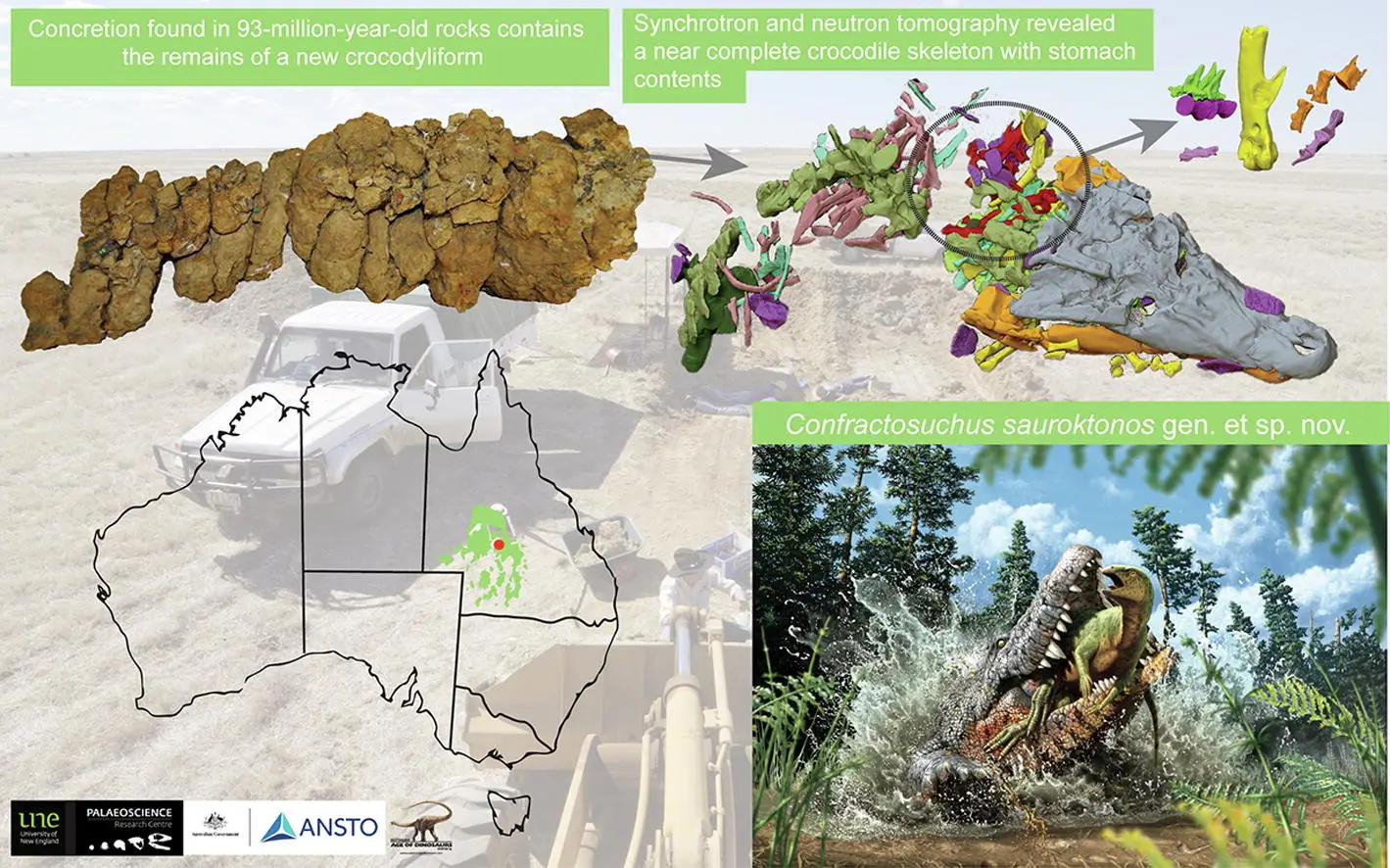 Senior Instrument Scientist Dr Joseph Bevitt, co-author of the study, said: “The fossilised remains were found in a large boulder. Concretions often form when organic matter, or say a crocodile, sinks to the bottom of a river.