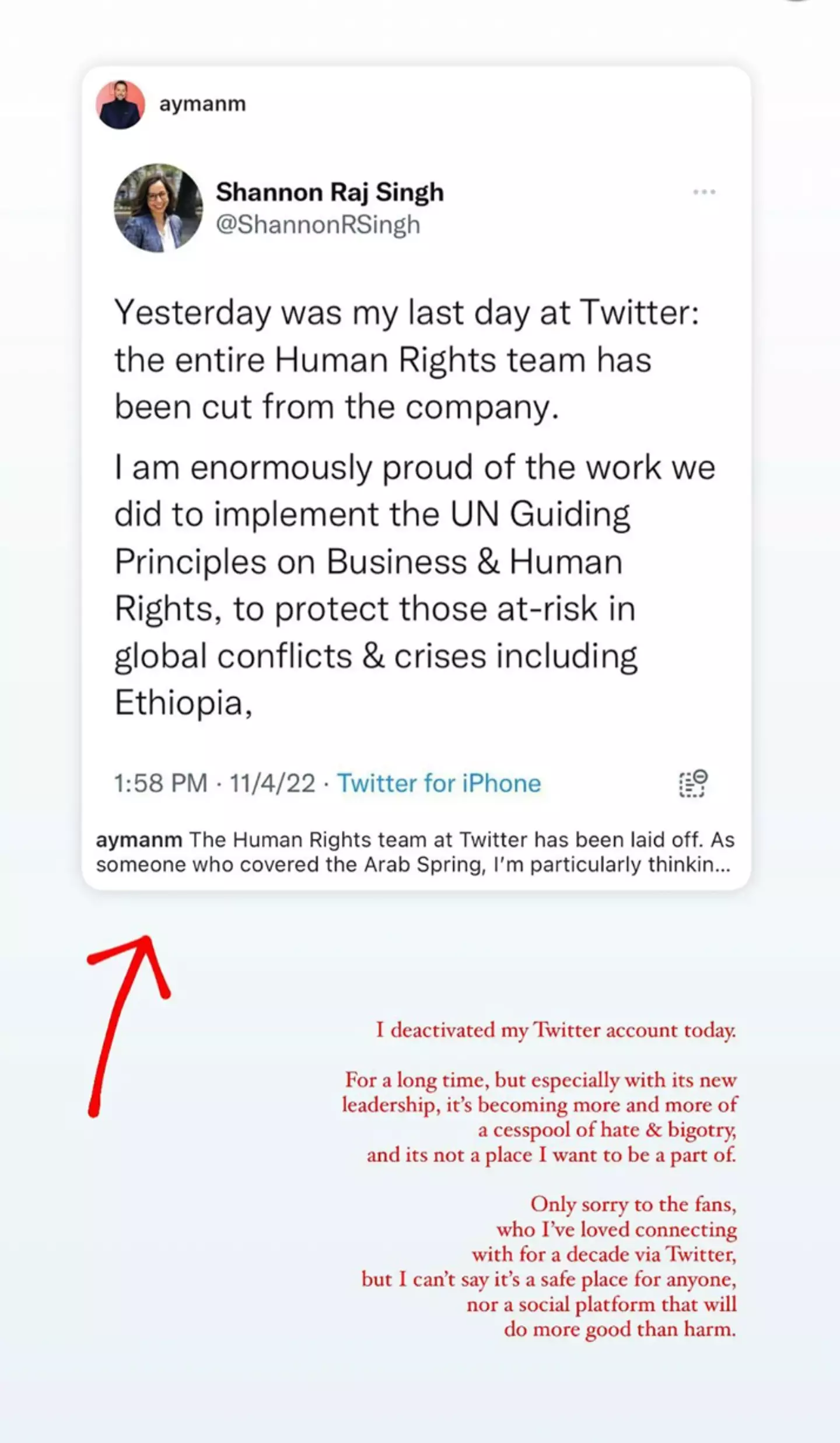 The 27-year-old re-posted a tweet from former Twitter employee, Shannon Raj Singh, who revealed that Musk was culling the ‘entire Human Rights team’.