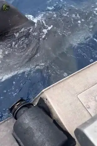 The fishermen held their breath as the great white brushes itself against their boat.