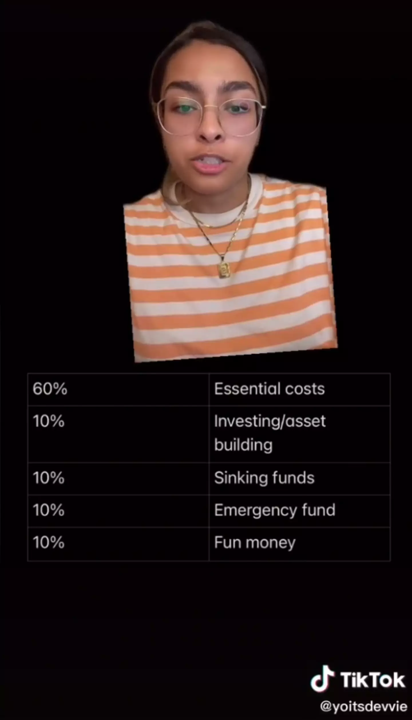 60 percent goes towards essential living costs, 10 percent towards paying off her debts, 10 percent for investments and asset building, 10 percent for fun money and the last 10 percent goes into an emergency fund.