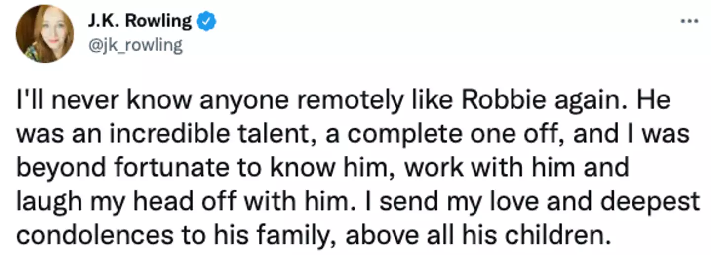 Taking to social media, she wrote: "I'll never know anyone remotely like Robbie again. He was an incredible talent, a complete one off, and I was beyond fortunate to know him, work with him and laugh my head off with him.