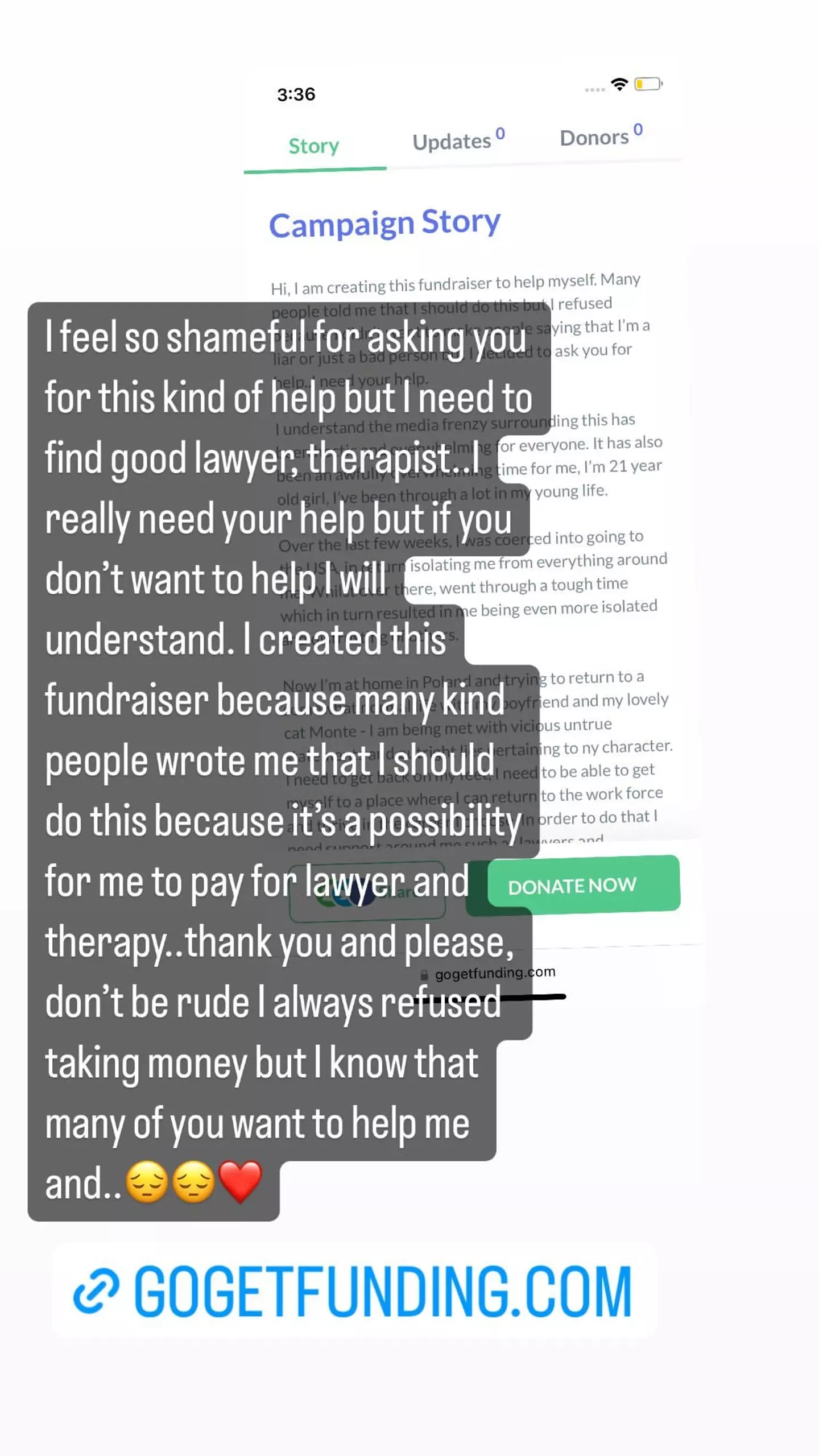 “I created this fundraiser because many kind people wrote me that I should do this because it’s a possibility for me to pay for lawyer and therapy... Thank you and please, don't’ be rude, I always reused taking money but I know that many of you want to help me.”