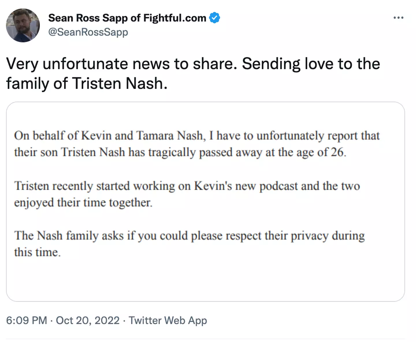 It reads: "On behalf of Kevin and Tamara Nash, I have to unfortunately report that their son Tristen Nash has tragically passed away at the age of 26.