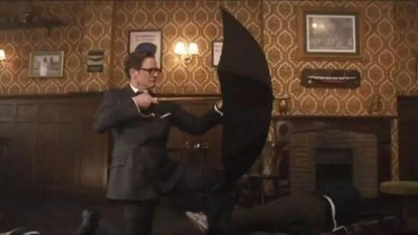 For context, Colin Firth's British super spy uses an umbrella as a gun in the Kingsman films, which might explain the slightly strange leap of logic.