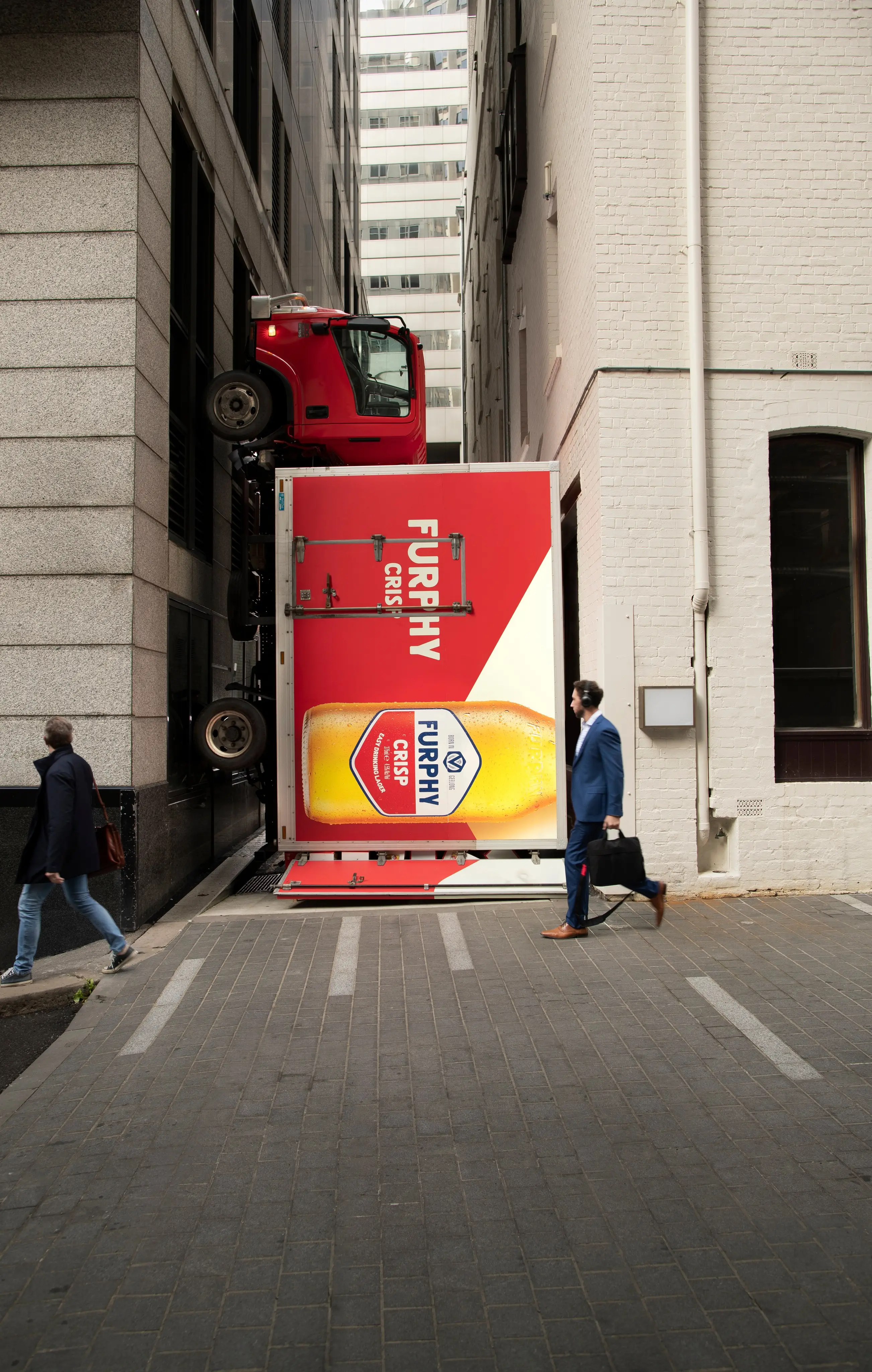 Though it’s still unclear how the Furphy Crisp Lager truck became trapped, the vehicle was firmly wedged between two buildings, unable to escape from the tight space.
