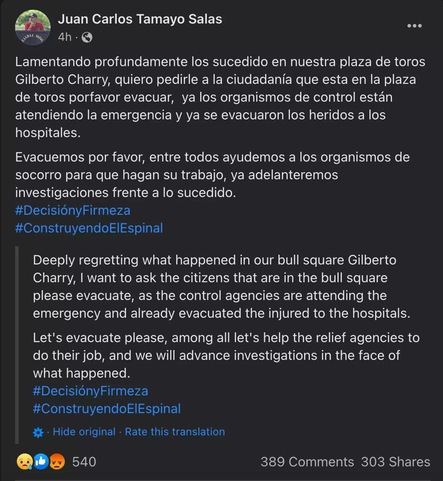 The Mayor of Espinal, Juan Carlos Tamayo, also confirmed the tragedy via a Facebook post: “Deeply regretting what happened in our bull square Gilberto Charry.