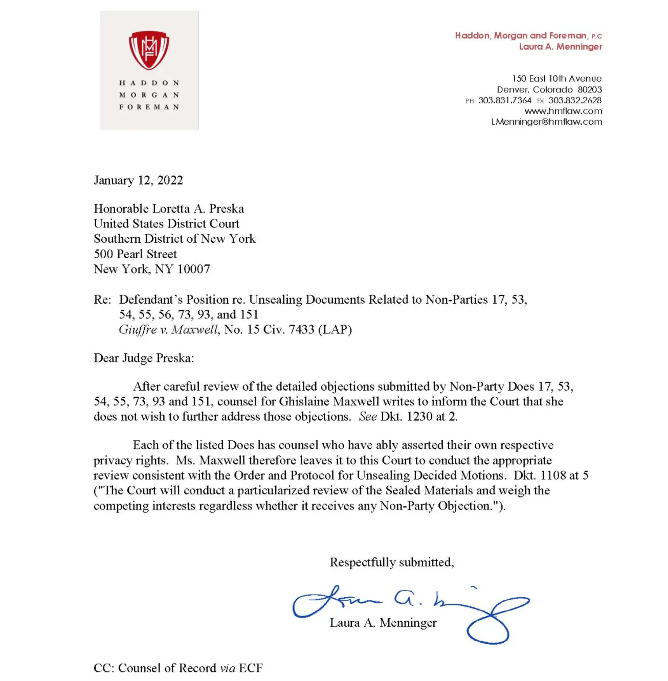 Laura Menninger, one of the lawyers working for Maxwell, wrote a letter to Judge Loretta Preska this week explaining they would no longer stand in the way of the names being unsealed.