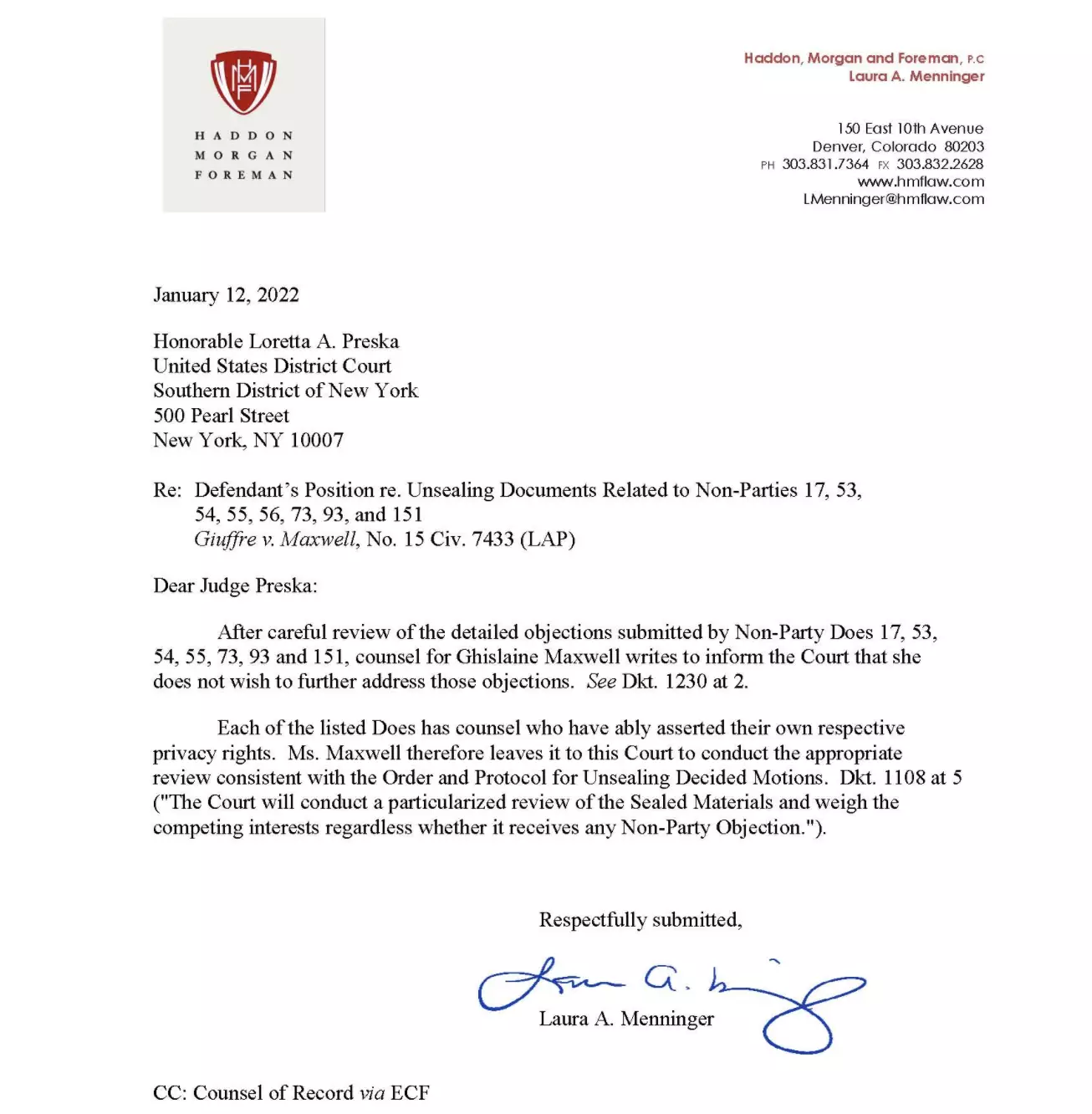 Laura Menninger, one of the lawyers working for Maxwell, wrote a letter to Judge Loretta Preska this week explaining they would no longer stand in the way of the names being unsealed.