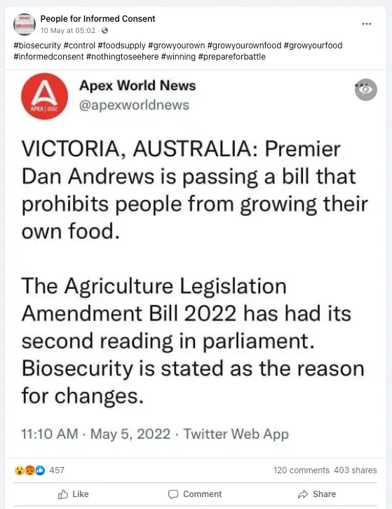 People for Informed Consent shared a social media post about a bill before the Victorian Legislative Assembly, which they have grossly misunderstood.