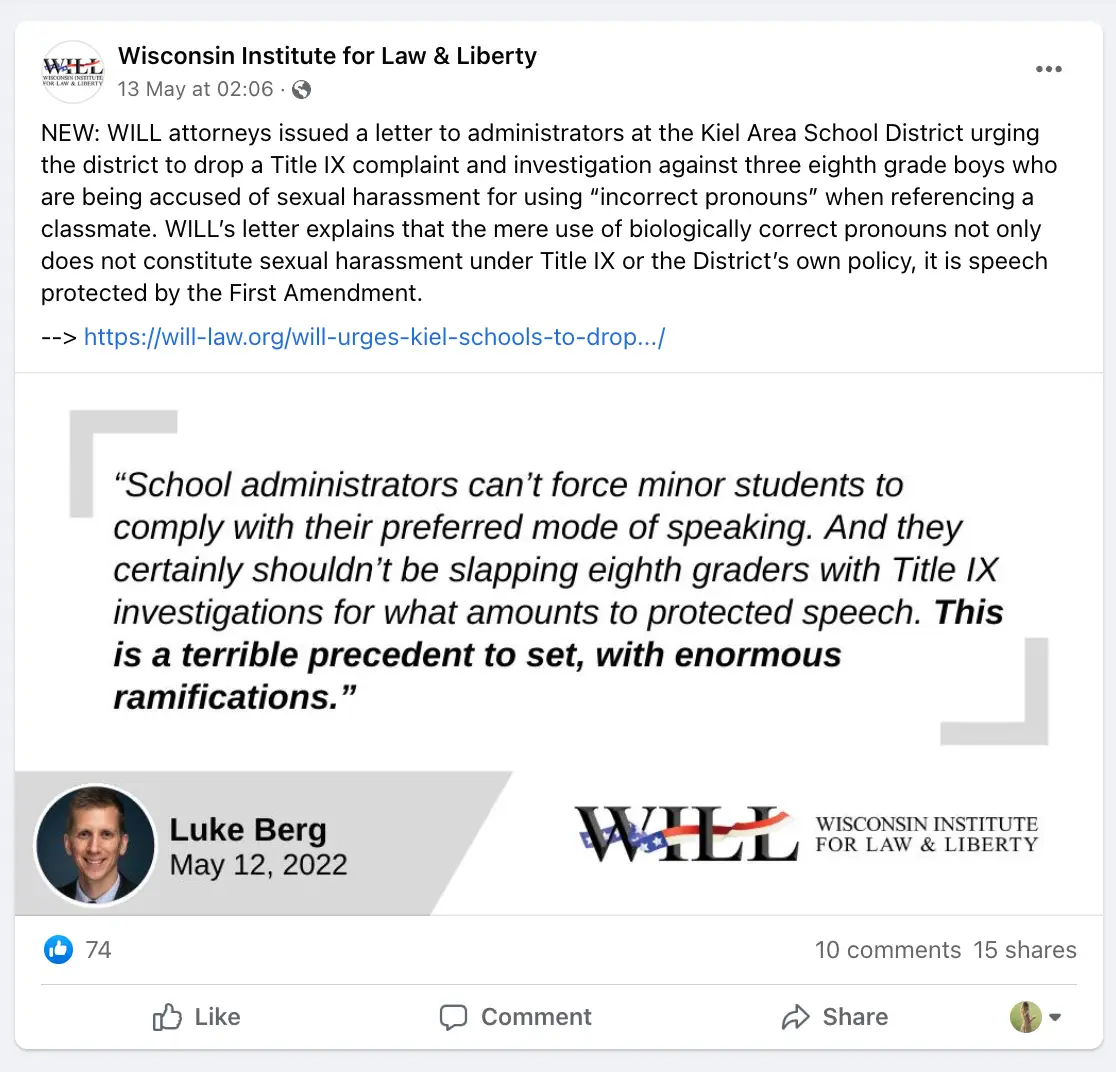 The Wisconsin Institute for Law and Liberty (WILL) is defending the accused boys and refutes claims that misuse of pronouns is not covered by Title IX, the legislation that protects people from discrimination based on sex in the education system.