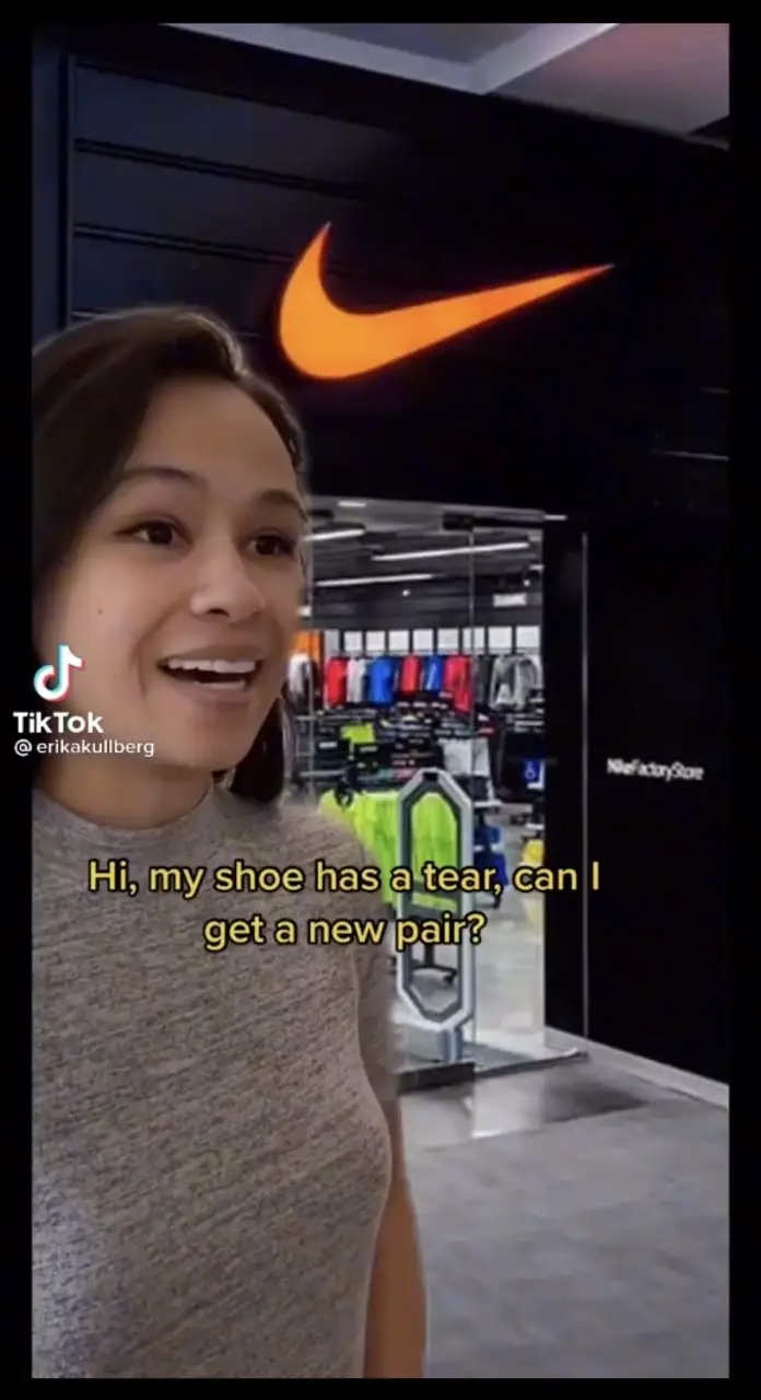 Erika begins her video by asking: “Hi, my shoe has a tear. Can I get a new pair?”