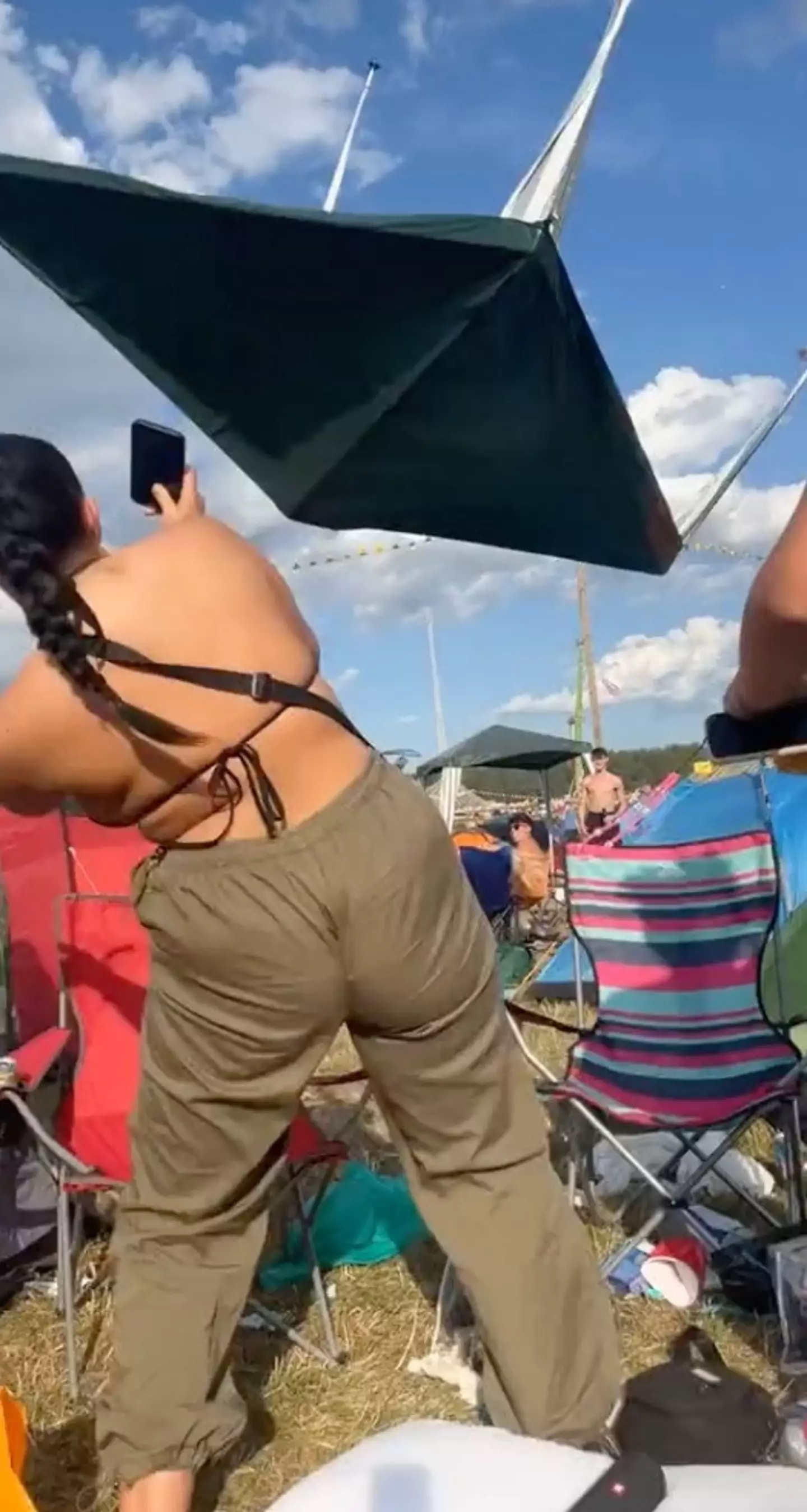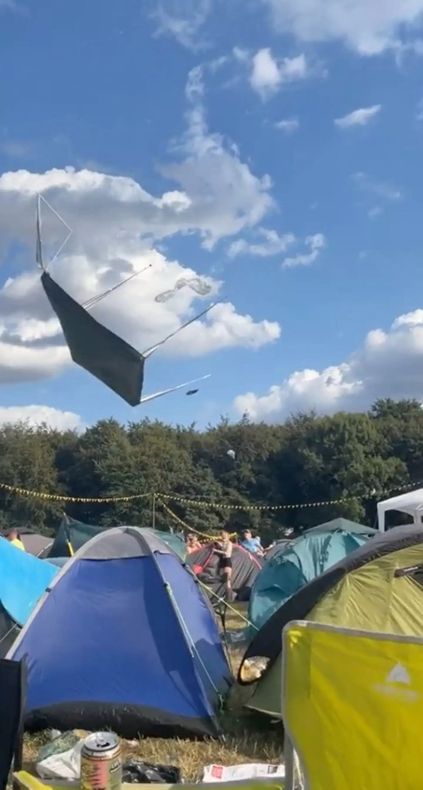 As the flying gazebo looks to be drifting one way, it rapidly swings back in the direction of the festival-goer, who almost gets whacked in the face as a result.