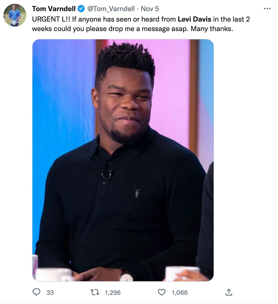 Levi, who currently plays for Worthing Raiders, has been missing for over a week after he disappeared while on holiday with friends in Barcelona on 29 October.