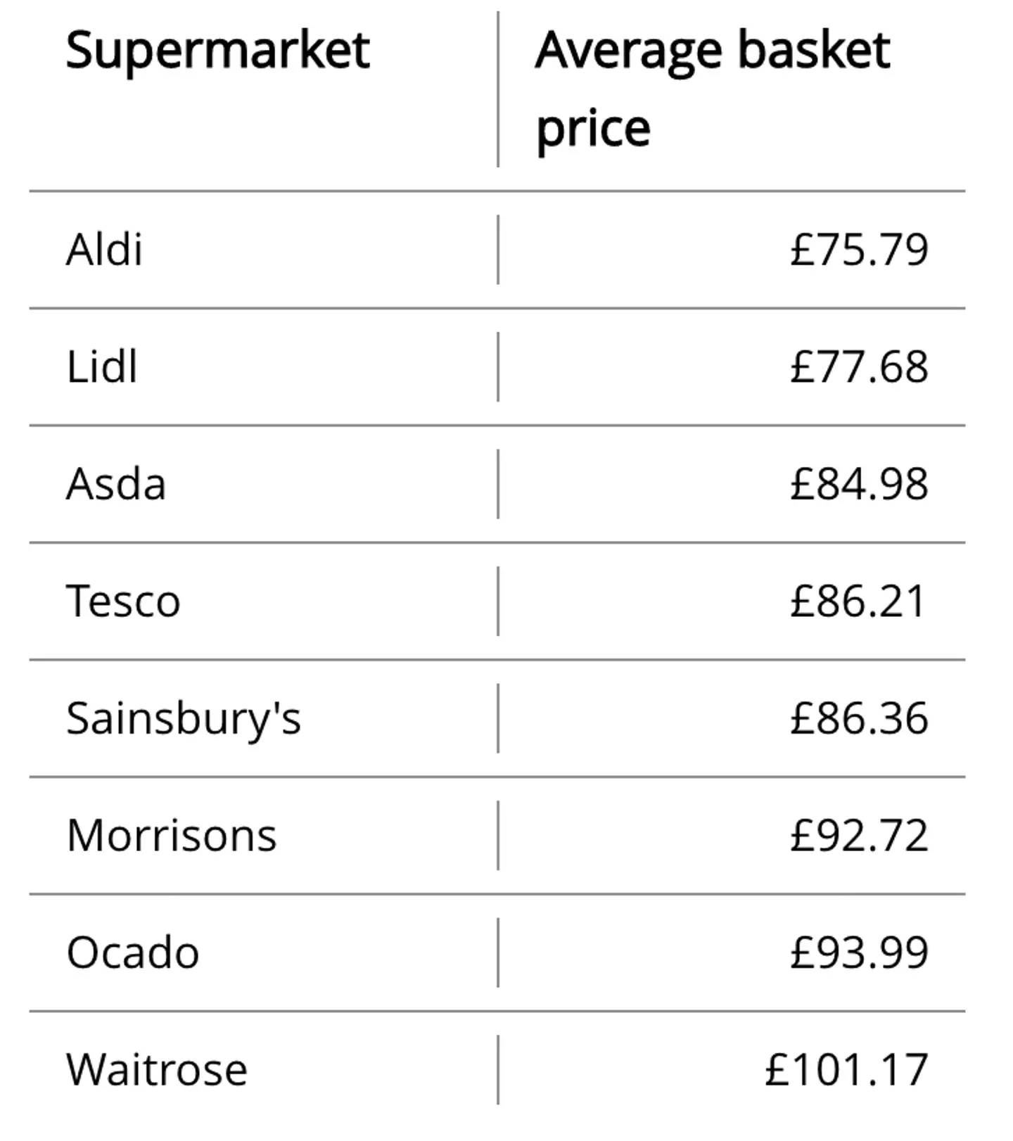 Which? found that Aldi has the cheapest overall at a trolley of groceries coming in at an average of £75.79 - £25 cheaper than the most expensive option, Waitrose.