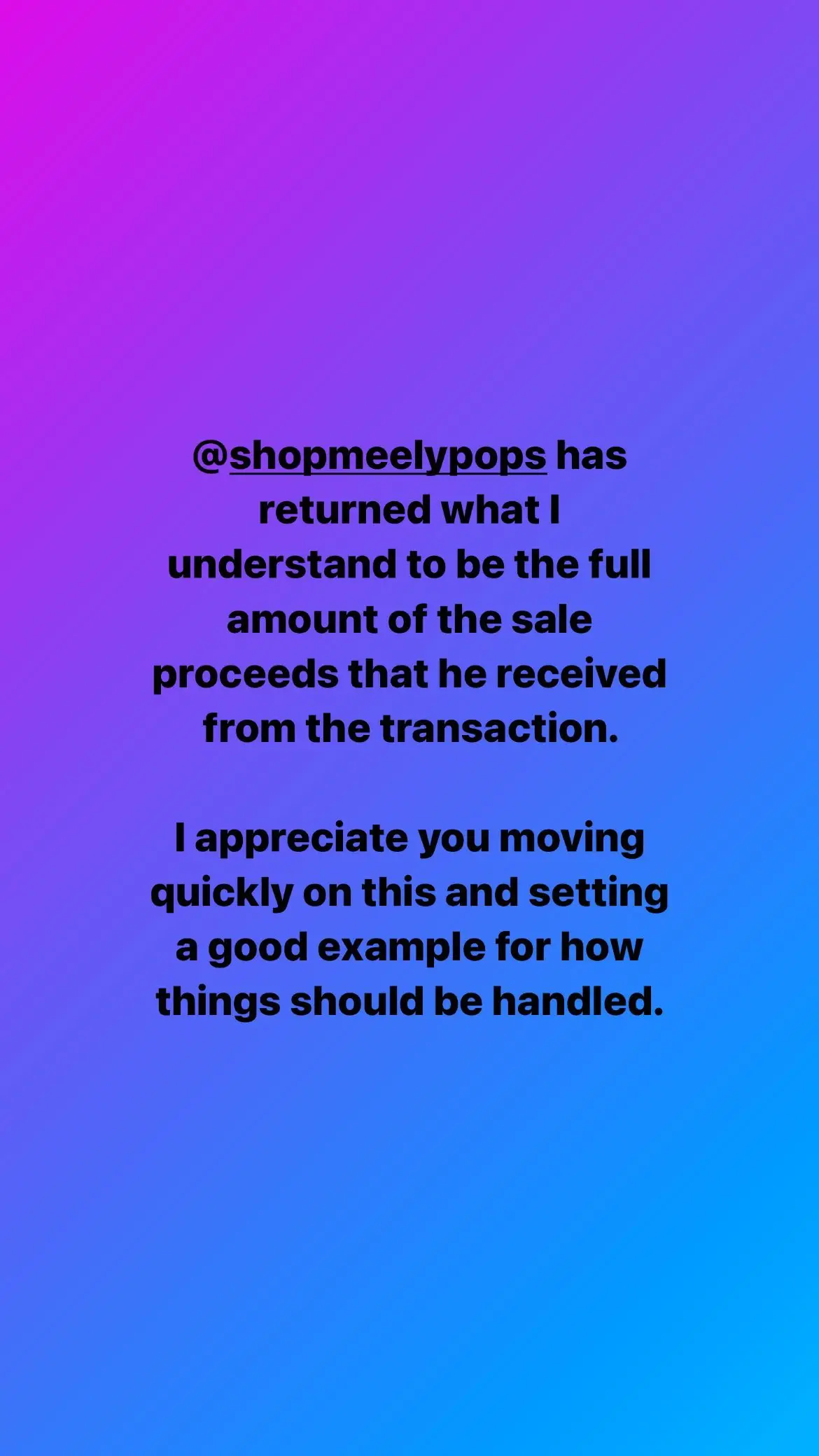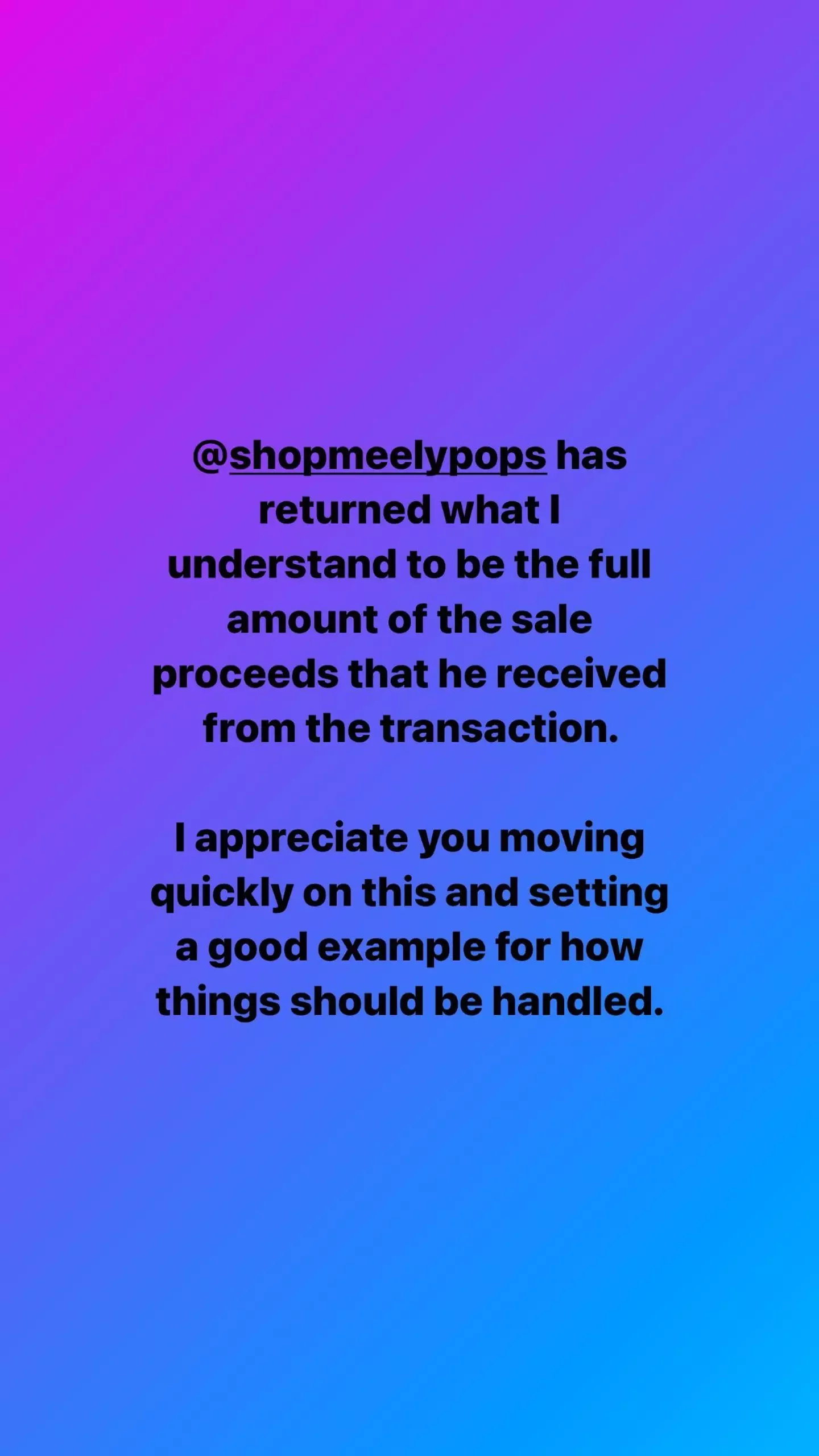 And now the dealer says he has received his own money back from Meelypops, saying in a new update: “@shopmeelypops has returned what I understand to be the full amount of the sale proceeds that he received from the transaction.