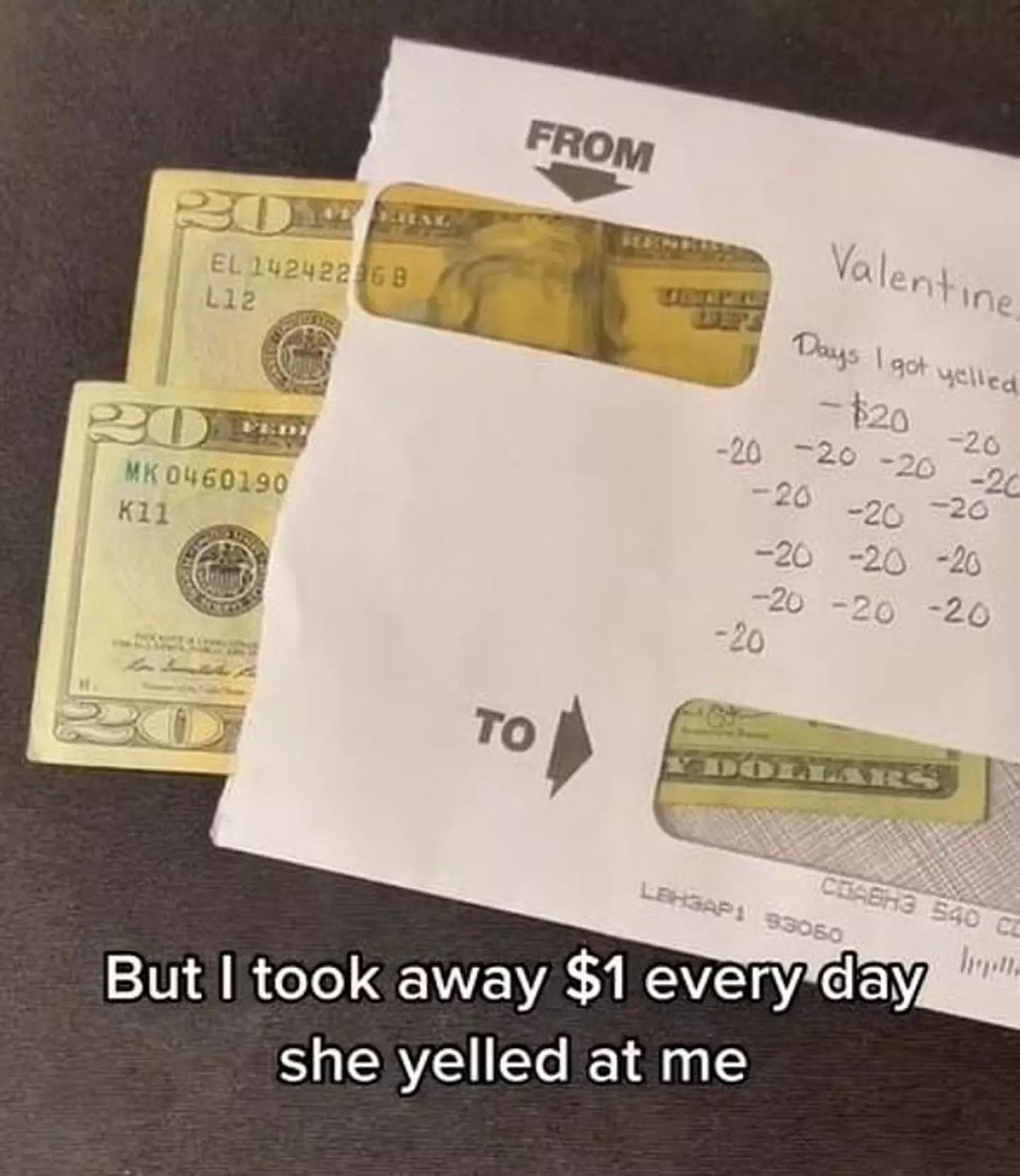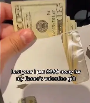 "Last year I put $360 (£265.37) away for my fiancée’s Valentine's Day gift, but I took away $1 every day she yelled at me," he wrote in the video, after showing off an envelope labelled as 'Valentine's Day 2022'.