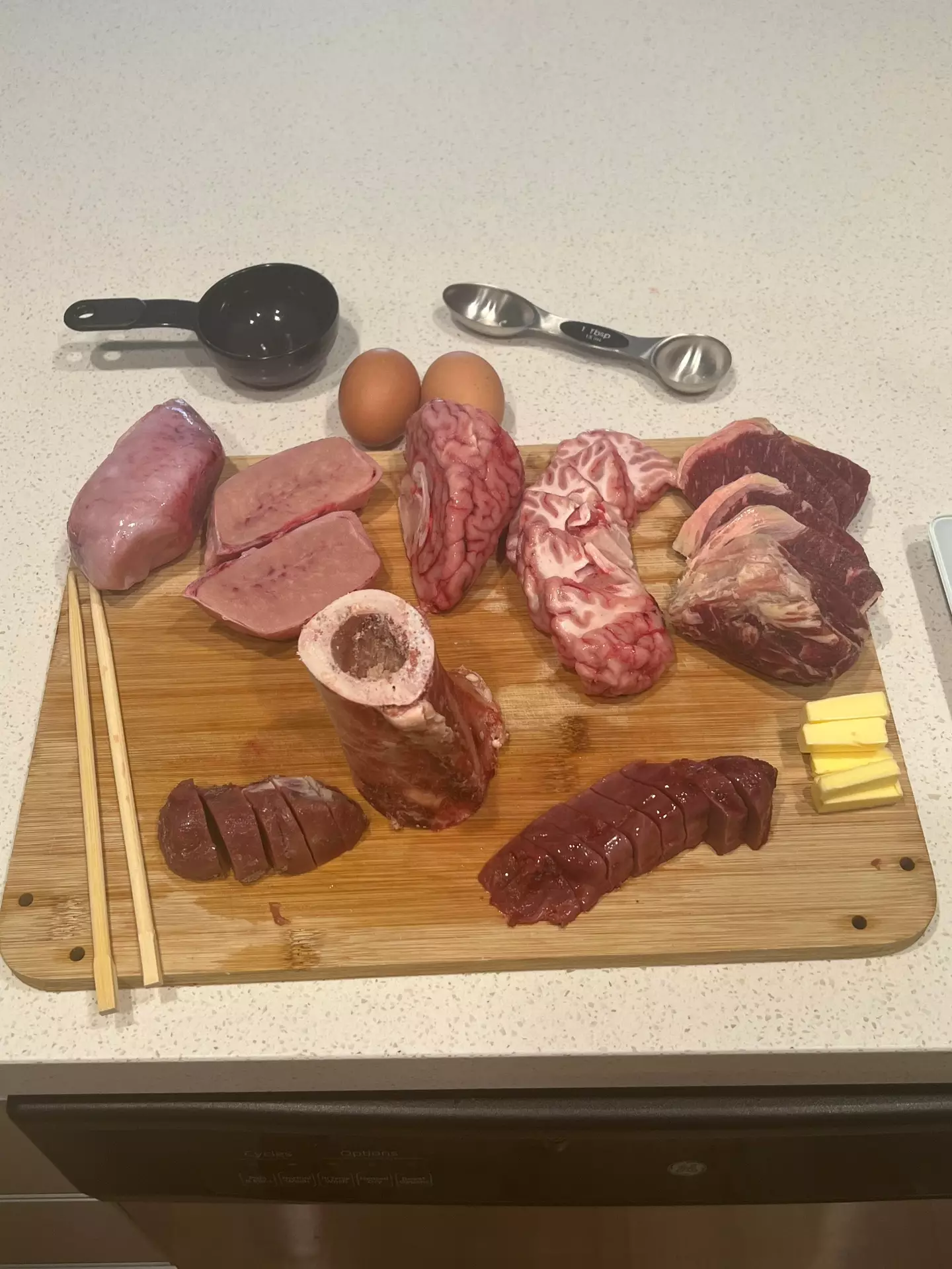 For lunch, Breiche he’ll eat two veal testicles, one veal brain, lamb liver, beef heart, beef kidney, beef bone marrow and raw butter.