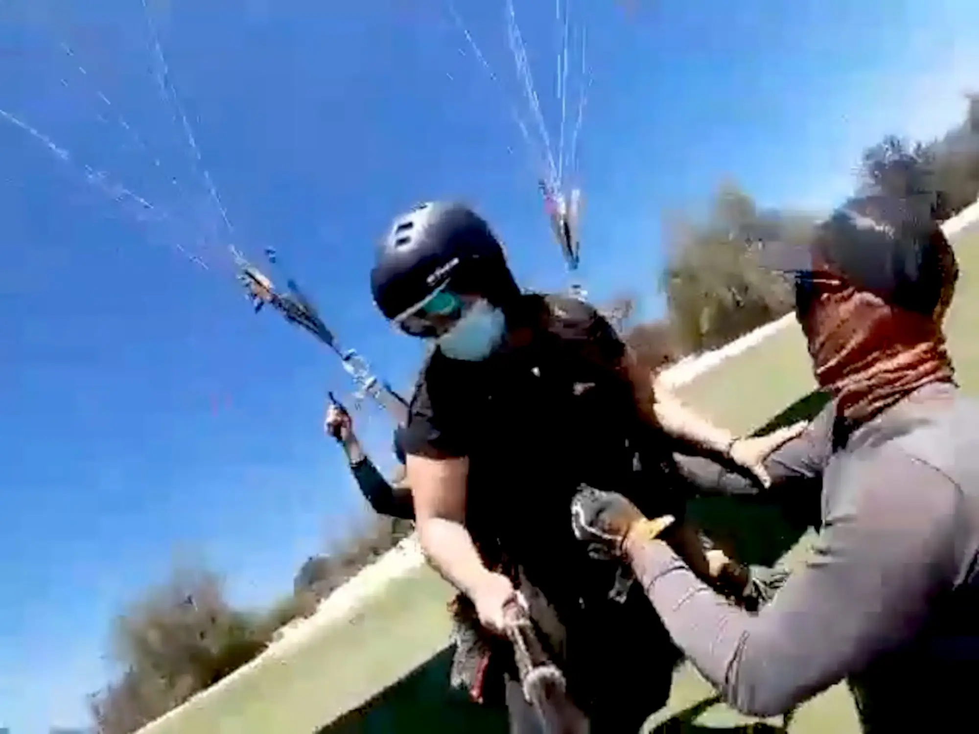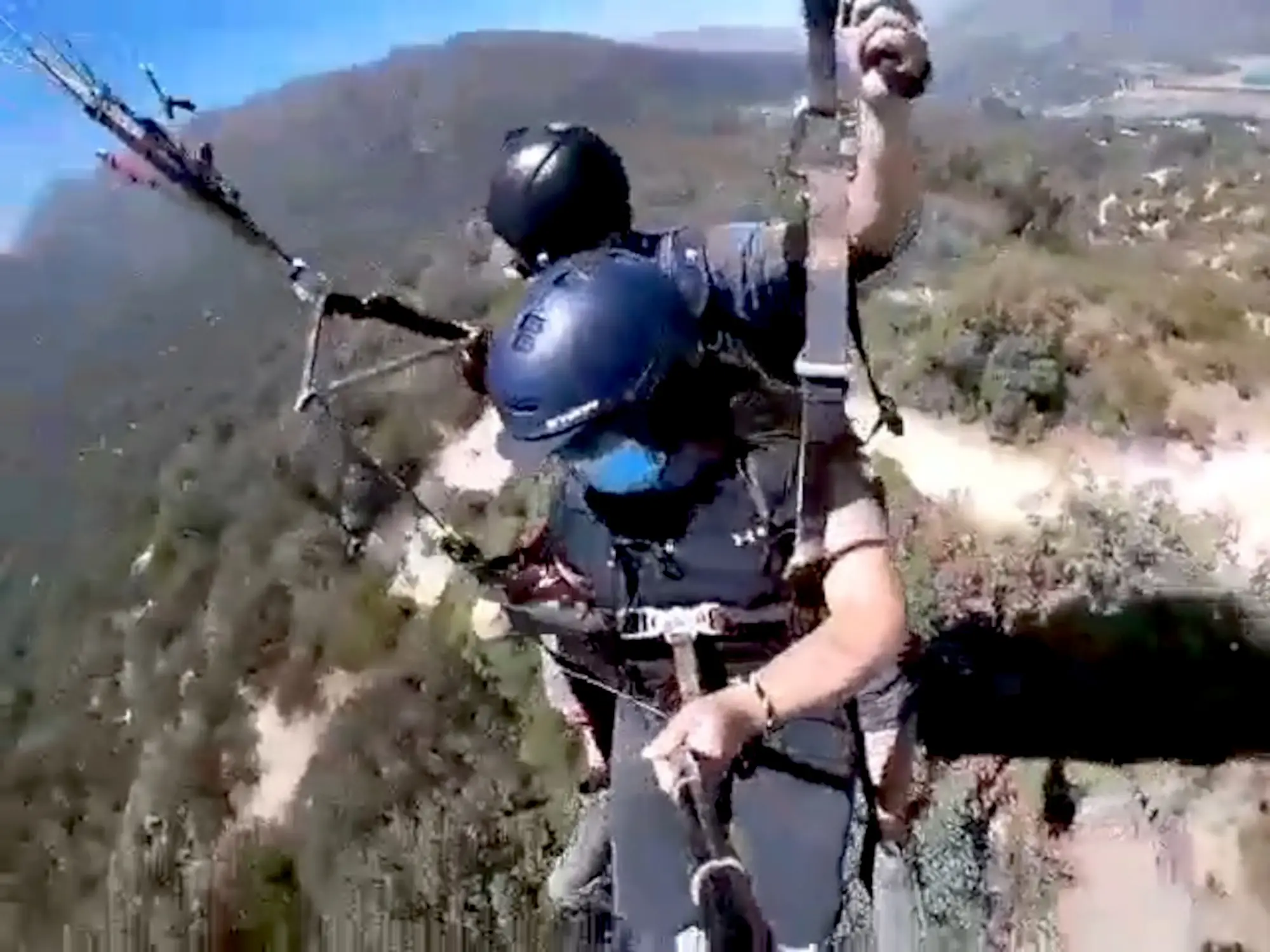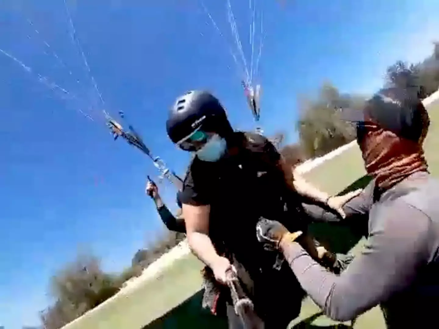 The video shows two people strapped into a paragliding aircraft and dressed in all the suitable gear, including crash helmets, just as it’s about to take off in the village of Las Vizcachas in Puento Alto in Cordillera, Chile