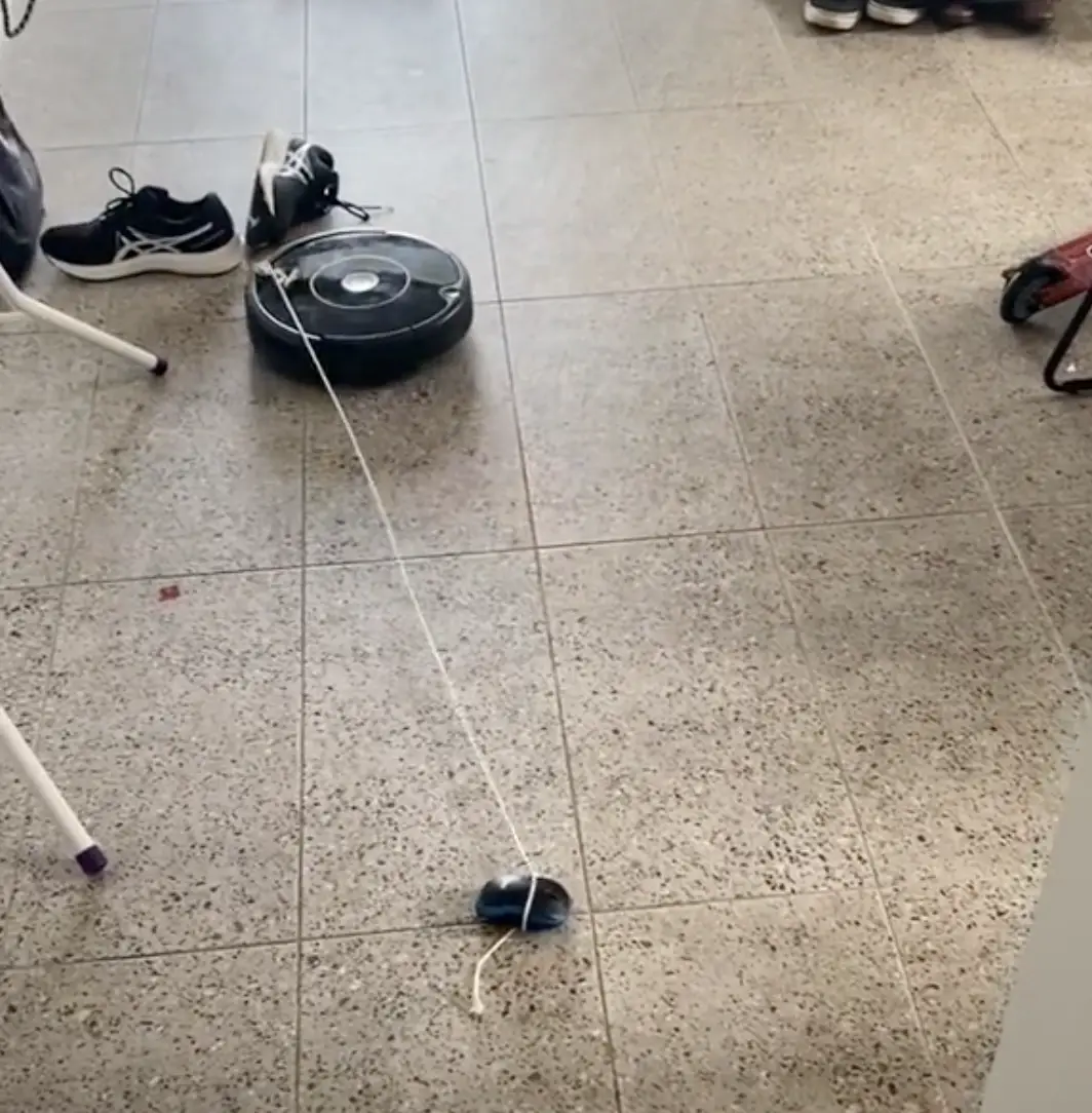 The user posted a video of his computer mouse attached to a robot vacuum cleaner as it drove around the house.