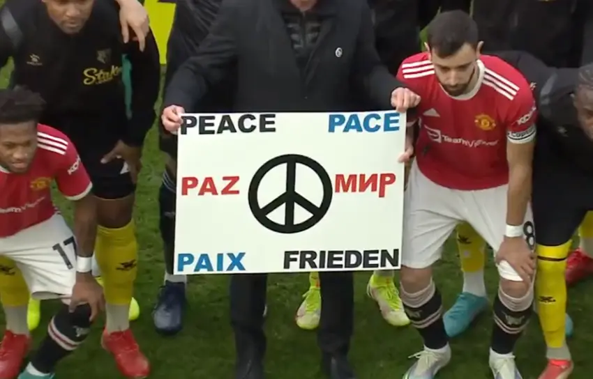 Manchester United and Watford took a moment this afternoon before their clash at Old Trafford to hold up a peace banner, in what looks to be an act of solidarity with Ukrainians.