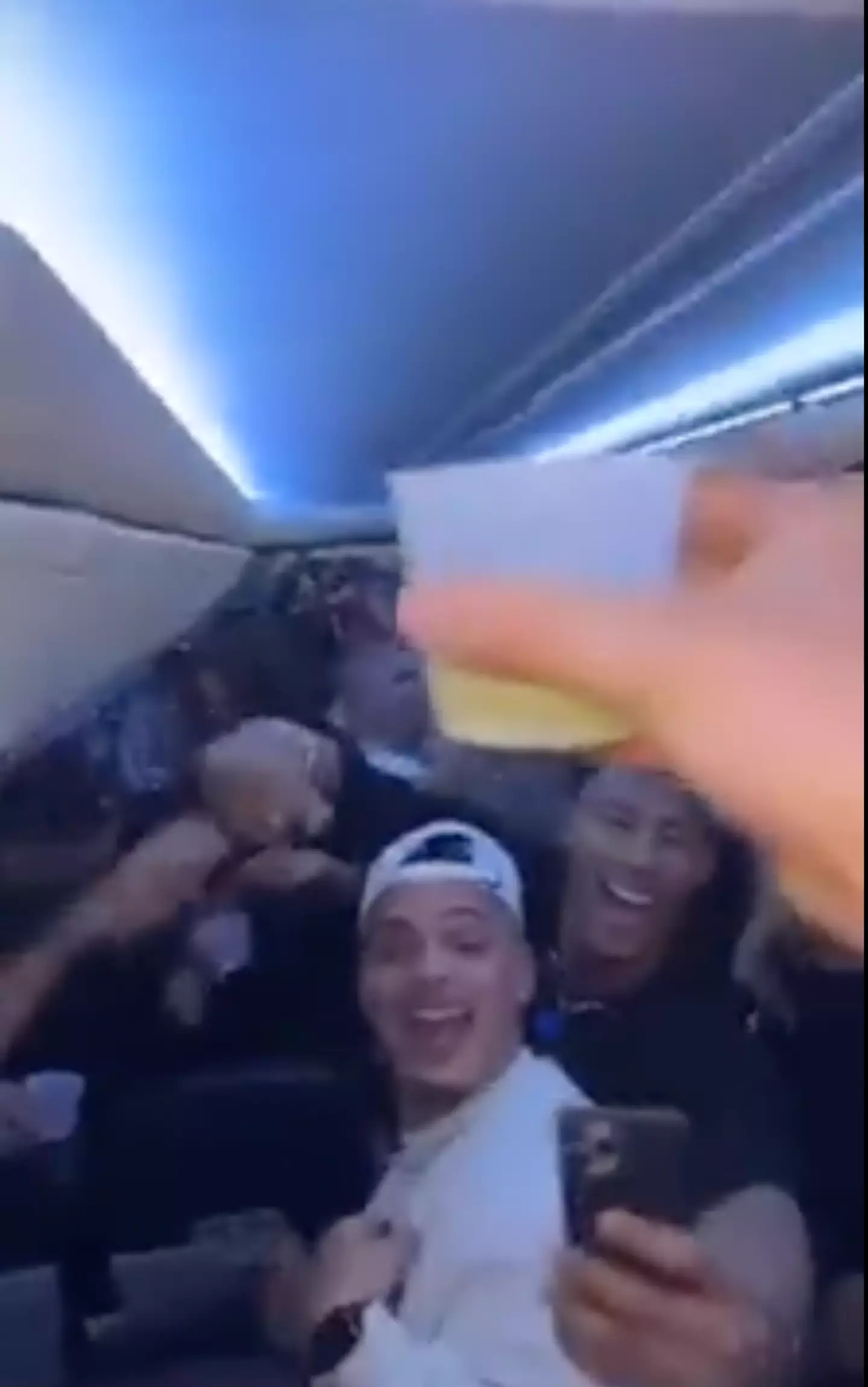 At one point in the video, which was originally uploaded by the group themselves on Instagram, 2 male passengers use the plane’s phone as a prop as they make a speech to their crowd that is met with a raucous of applause.
