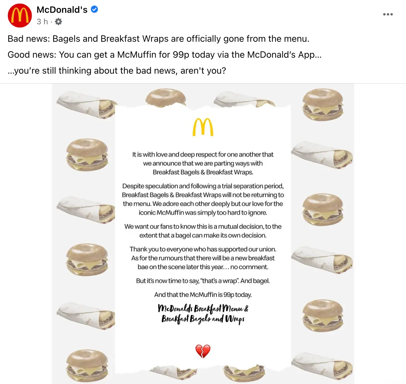"Despite speculation and following a trial separation period, Breakfast Bagels & Breakfast Wraps will not be returning to the menu. We adore each other deeply but our love for the iconic McMuffin was simply too hard to ignore."