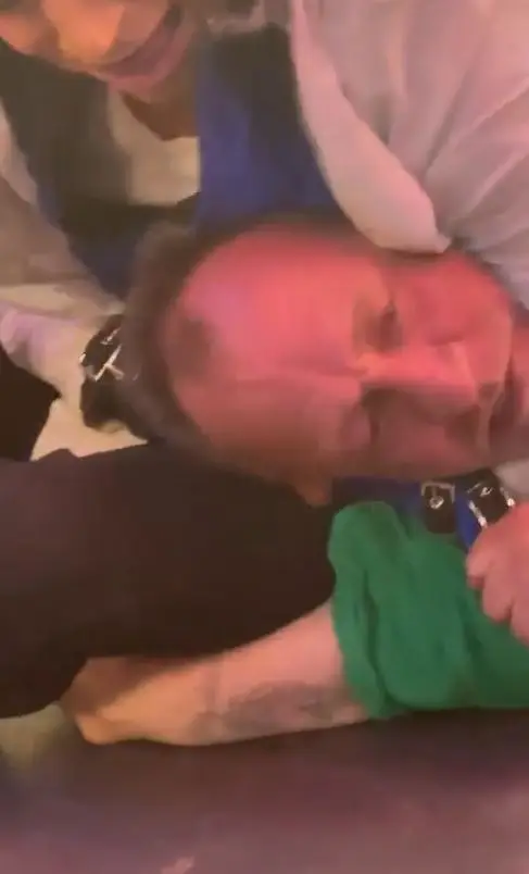The man’s eyes can be seen closing, while someone in the gathered crowd can be heard saying: “He’s out.”