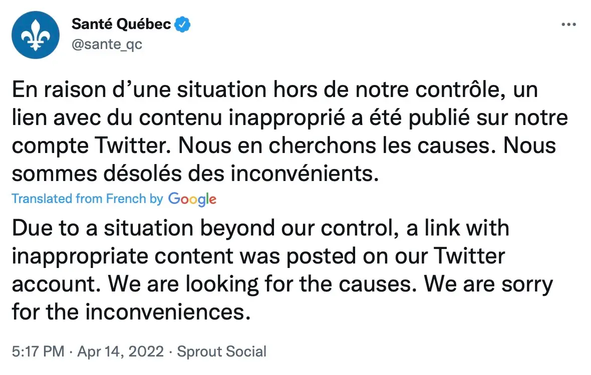 The health agency, also known as Santé Québec, later apologised and tweeted: "Due to a situation beyond our control, a link with inappropriate content was posted on our Twitter account. We are looking for the causes.