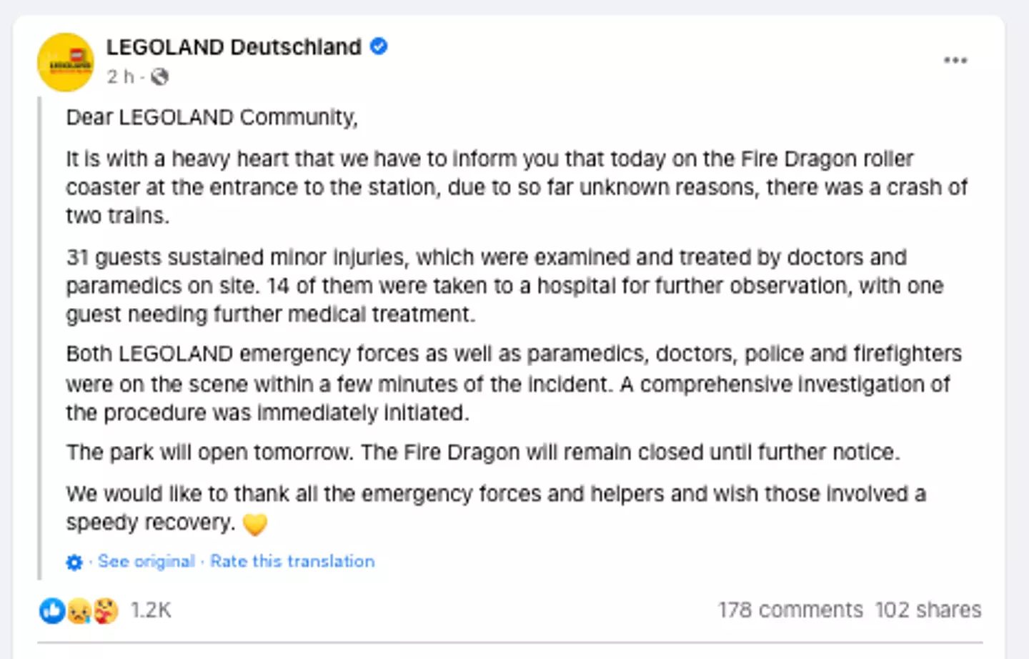 Legoland Deutschland praised emergency services for their prompt response.