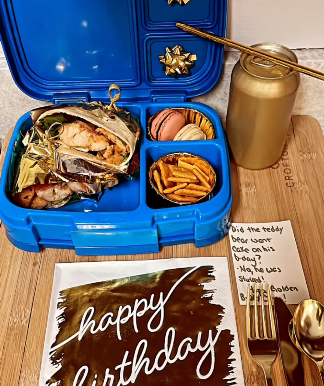 A mum has gone viral after sharing a video of a lunchbox she made for her son to take to school, having packed it with lobster, sparkling water and macaroons, and even introduced a gold colour scheme – a nod to his ‘golden birthday’. Take a look below: