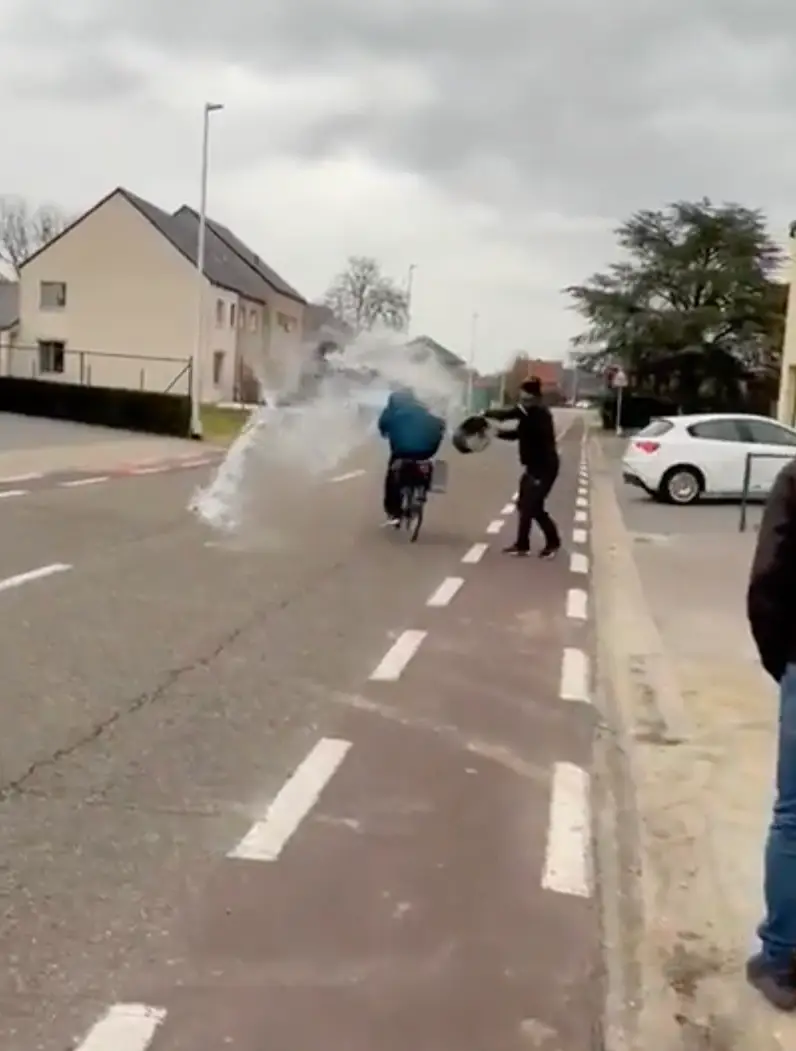 As one of the employees calls out to the man, the other throws the water over the offender, covering him from head to toe as he cycles off into the distance.