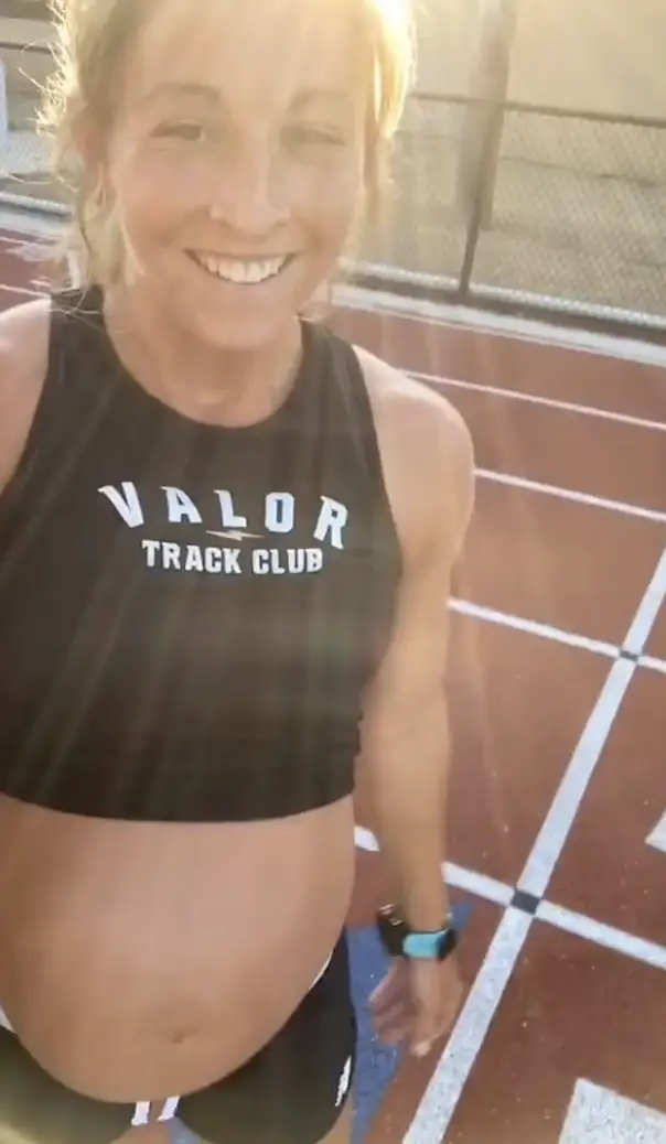 A heavily pregnant woman has stunned onlookers at a track meet in California after blitzing her way through a five minute mile.