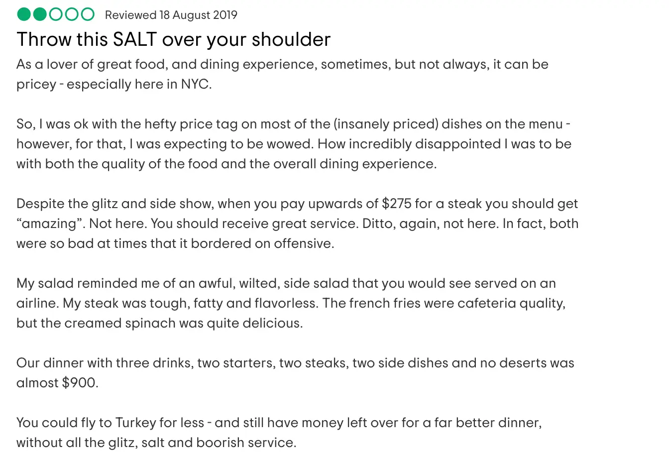 Despite notorious Turkish restaurateur Nusret Gökçe (Salt Bae) being an internet sensation, not even his clout can save the reputation of this eatery.
