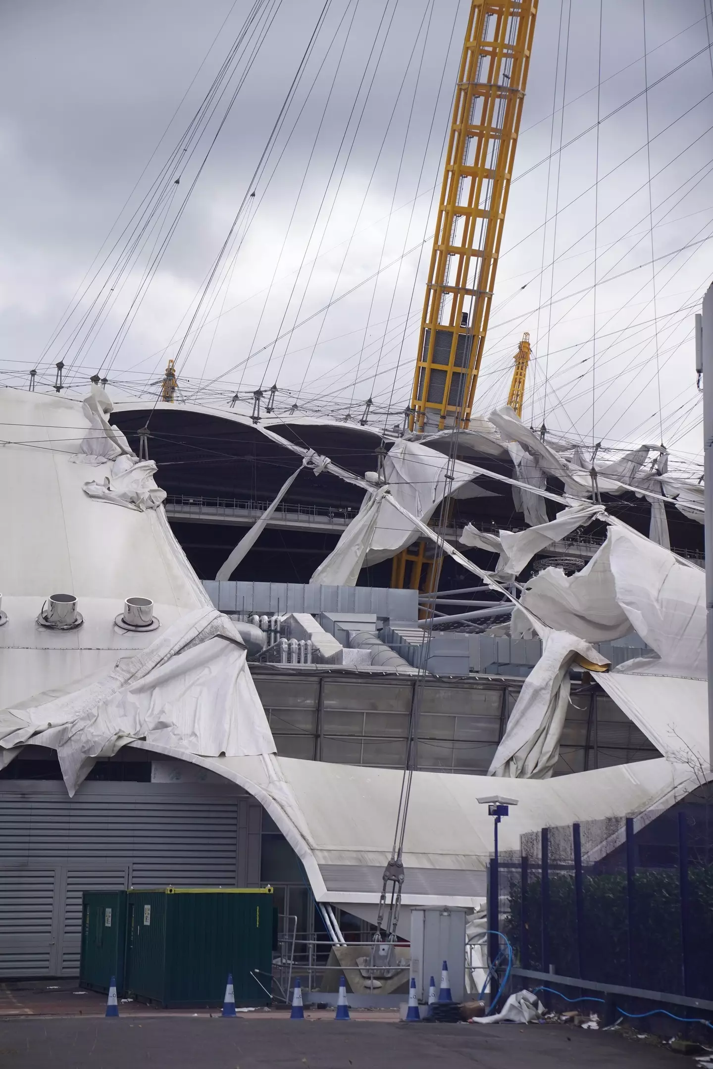 A statement from The O2 reads: "Due to today’s adverse weather conditions, we can confirm that there has been some damage caused to the tent fabric in our roof at The O2.