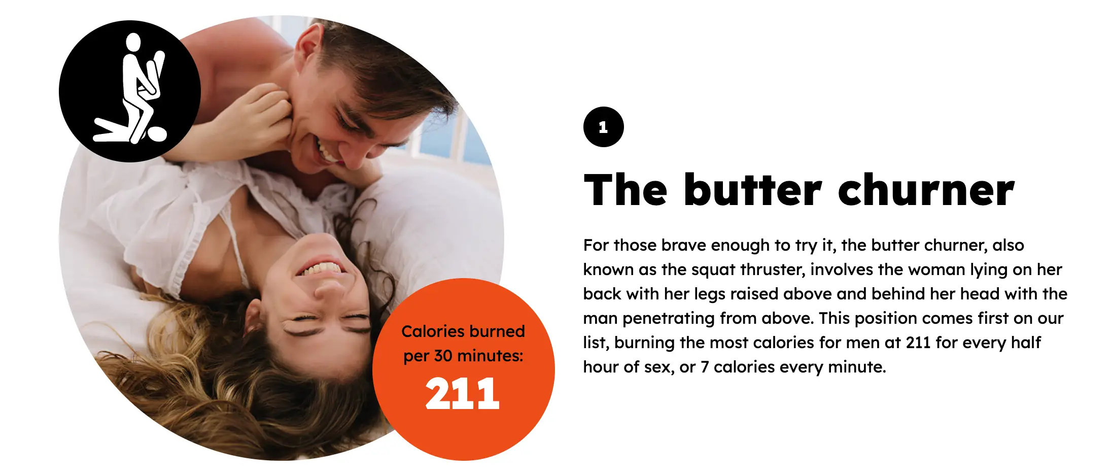 From Mars said: “This position comes first on our list, burning the most calories for men at 211 for every half hour of sex, or 7 calories every minute.”