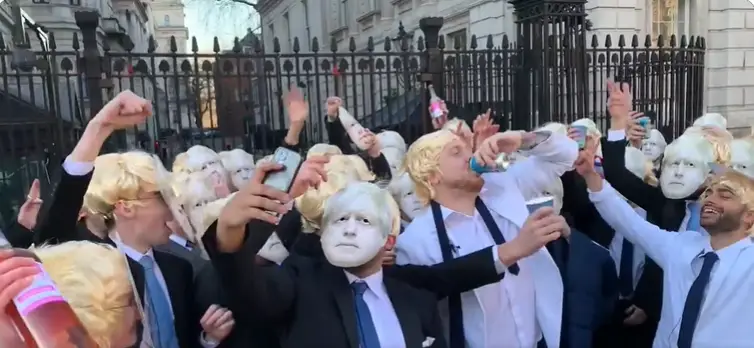 A group of around 100 people have dressed up as Boris Johnson and partied outside Downing Street. Watch here: