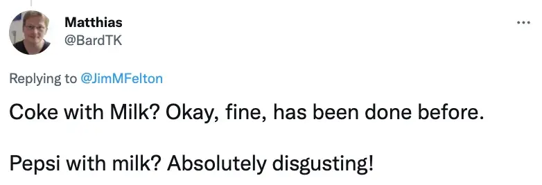 "Now I’ve never tried milk with Pepsi, but I’ve had milk with coke since I was a kid. I dunno where my dad got the idea or if it’s a common thing - but I like it."