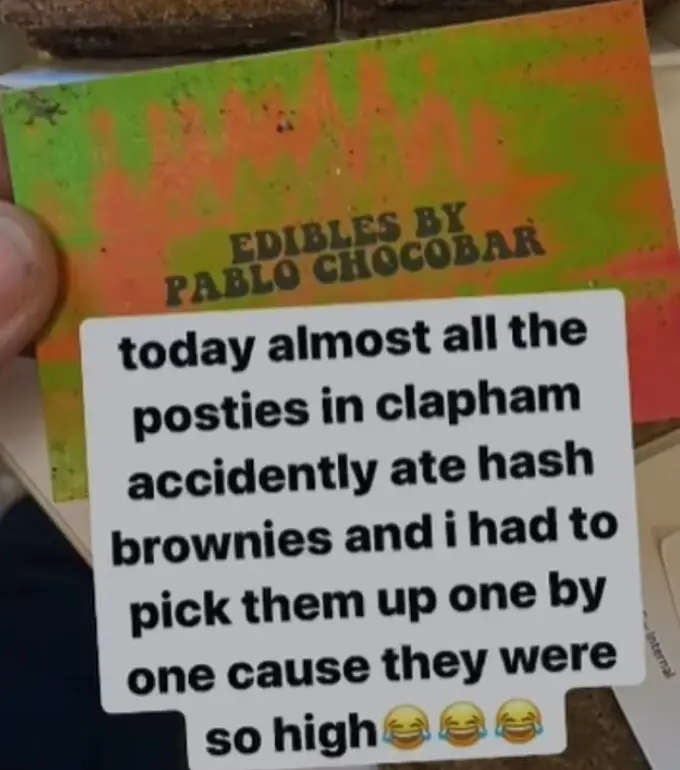 A caption on the video, overlaid on an image of the parcel marked ‘Edibles by Pablo Chocobar’, read: “Today almost all the posties in Clapham accidentally ate hash brownies and I had to pick them up one by one ‘cause they were so high.”