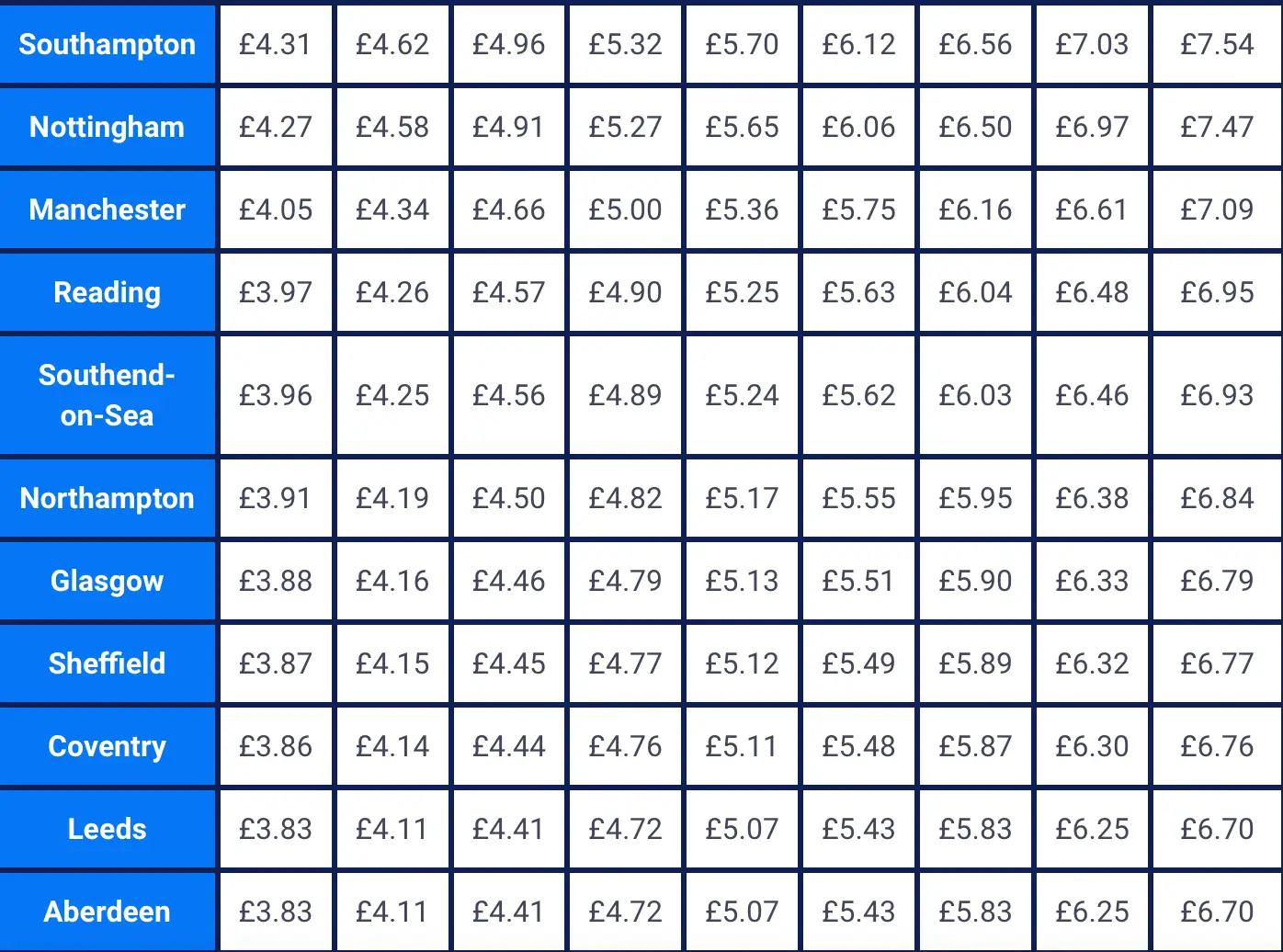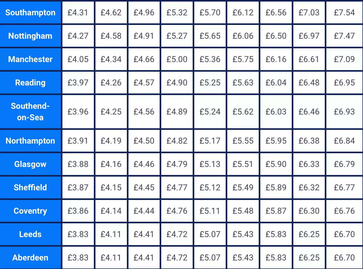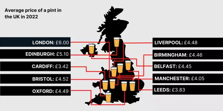 A pint in Liverpool will set you back £4.48 at the moment, by 2030 this could rise to £7.84. Manchester is similar with a pint costing £4.05 which could rise to £7.09 by 2030.