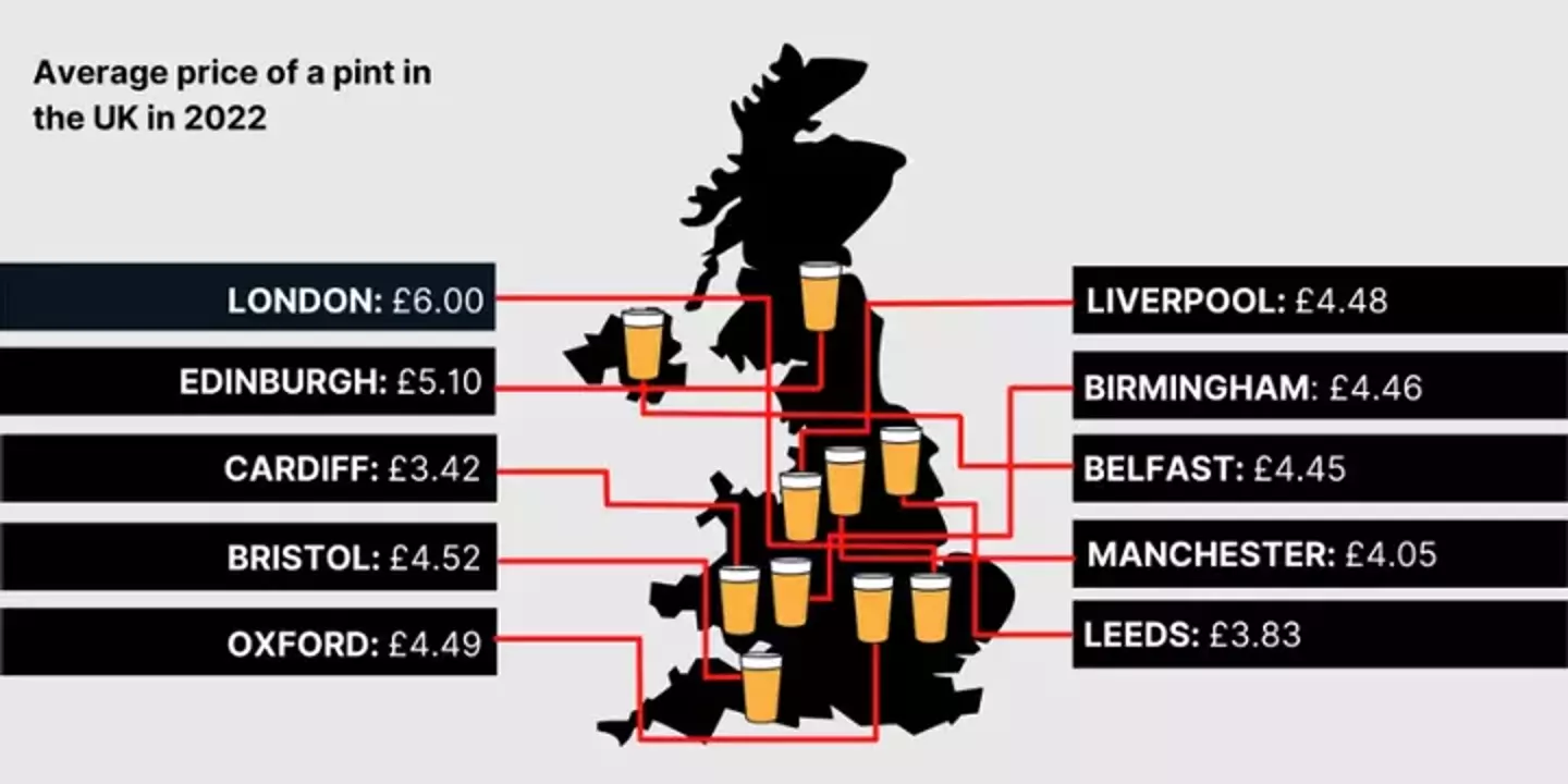 In Leeds it's around £3.83 for a beer, by 2030 this could rise to £6.70.