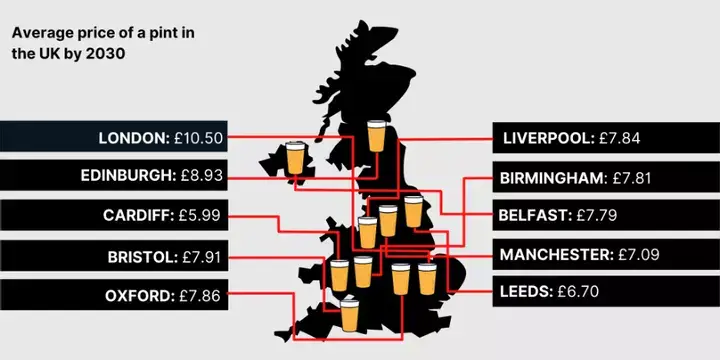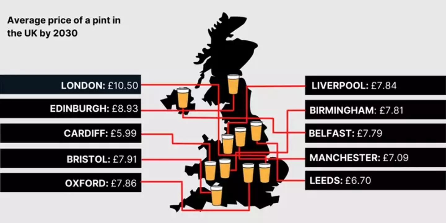 New research has analysed 25 cities and found that we could be paying £10.50 for a pint by 2030. £10.50 A PINT