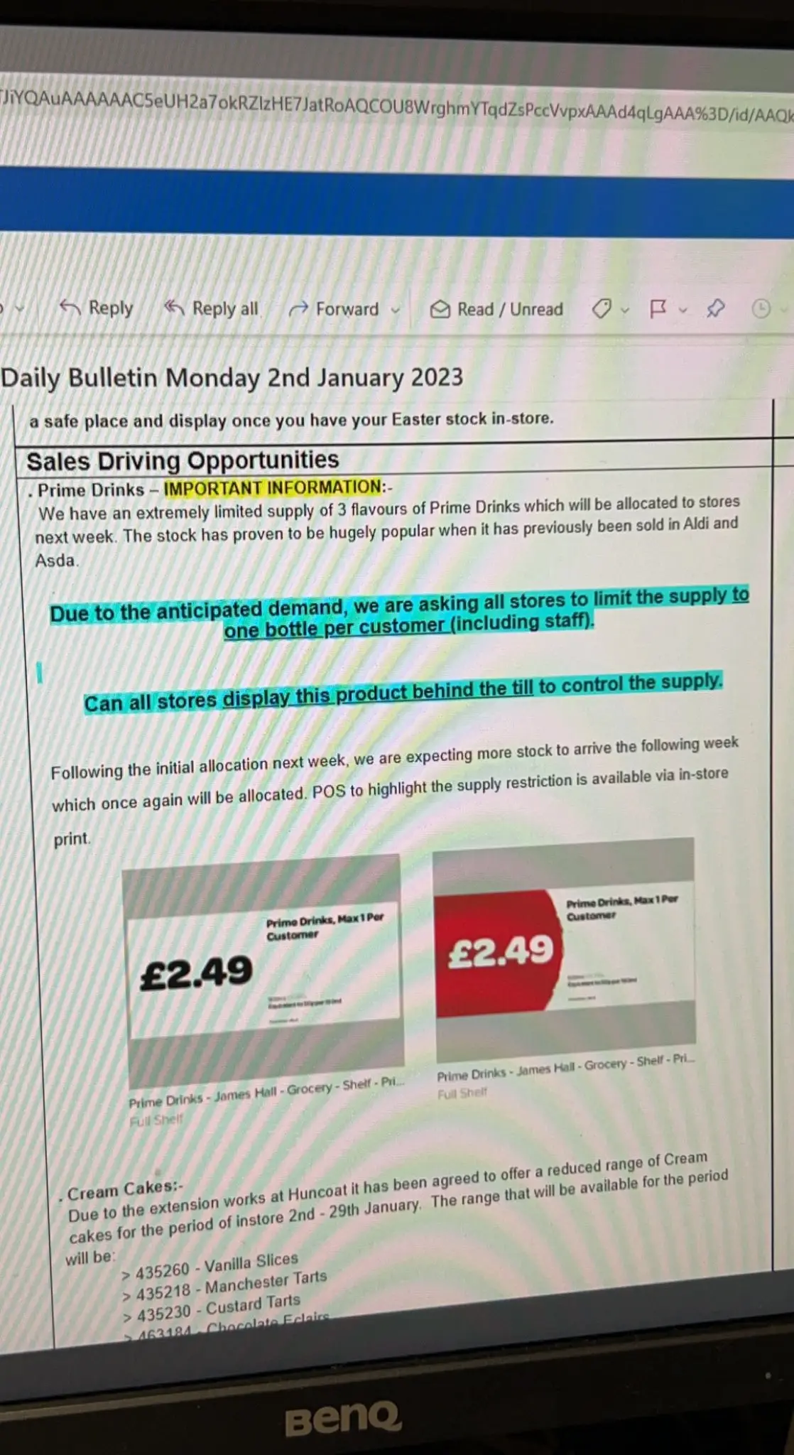 The screenshot reads: "We have an extremely limited supply of 3 flavours of Prime Drinks which will be allocated to stores next week. The stock has proven to be hugely popular when it has previously been sold in Aldi and Asda."